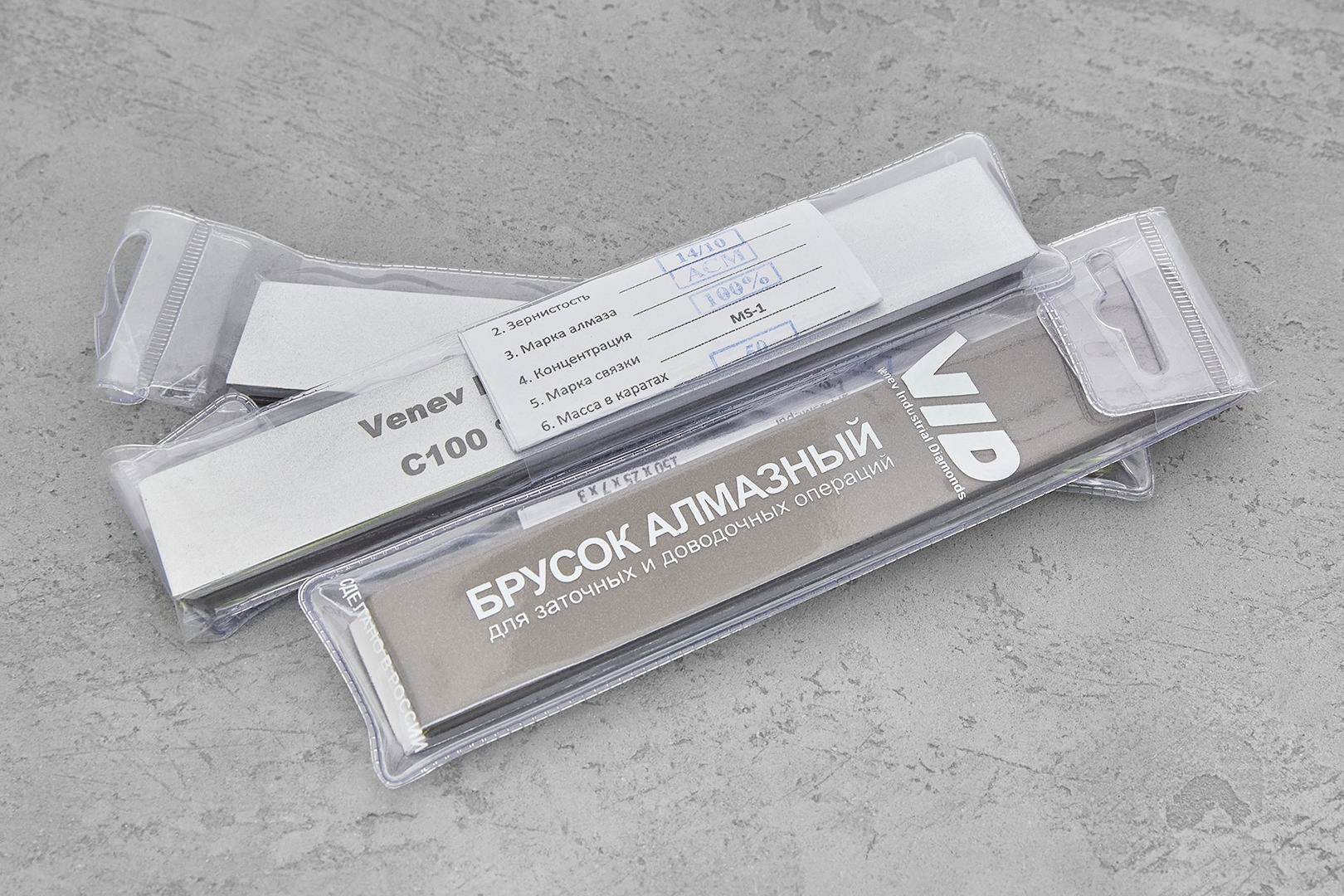 Размер бруска 150×25×7 мм. Толщина абразивного слоя 4 мм. Относительная концентрация алмазов в алмазоносном слое 100%. Связка – металлическая MS-1 с медно-оловянной основой и наполнителем из карбида кремния. Высокая жесткость связки позволяет быстро делать грубую работу.