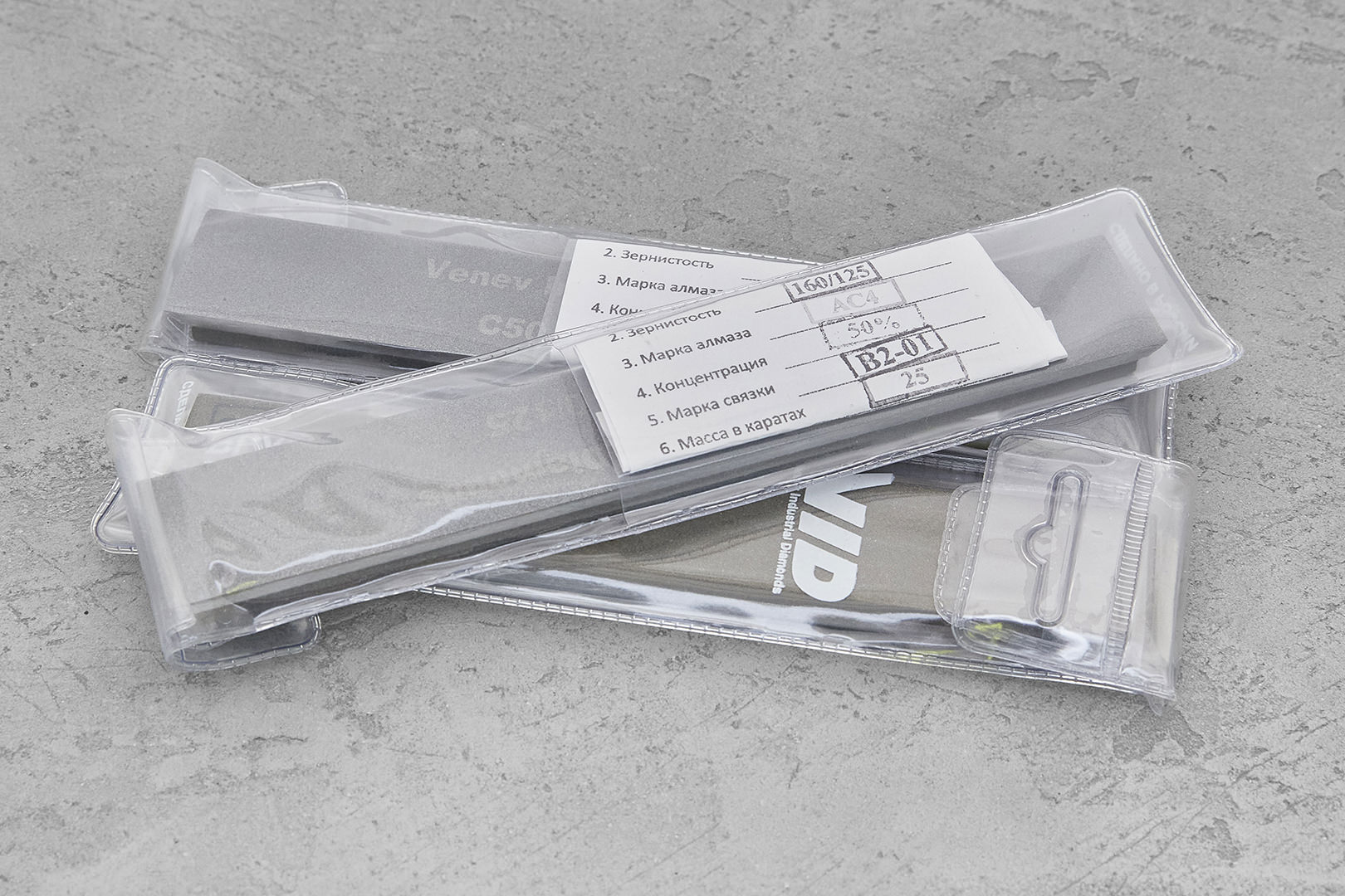 Размер бруска 150×25×6 мм. Толщина абразивного слоя 3 мм. Относительная концентрация алмазов в алмазоносном слое 50%, связка – органическая на бакелитовой основе с минеральным наполнителем B2-01, B1-10.