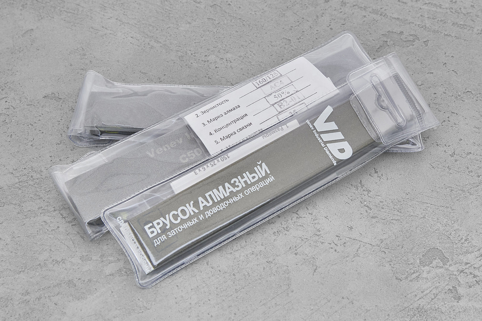 Размер бруска 150×25×6 мм. Толщина абразивного слоя 3 мм. Относительная концентрация алмазов в алмазоносном слое 50%, связка – органическая на бакелитовой основе с минеральным наполнителем B2-01, B1-10.