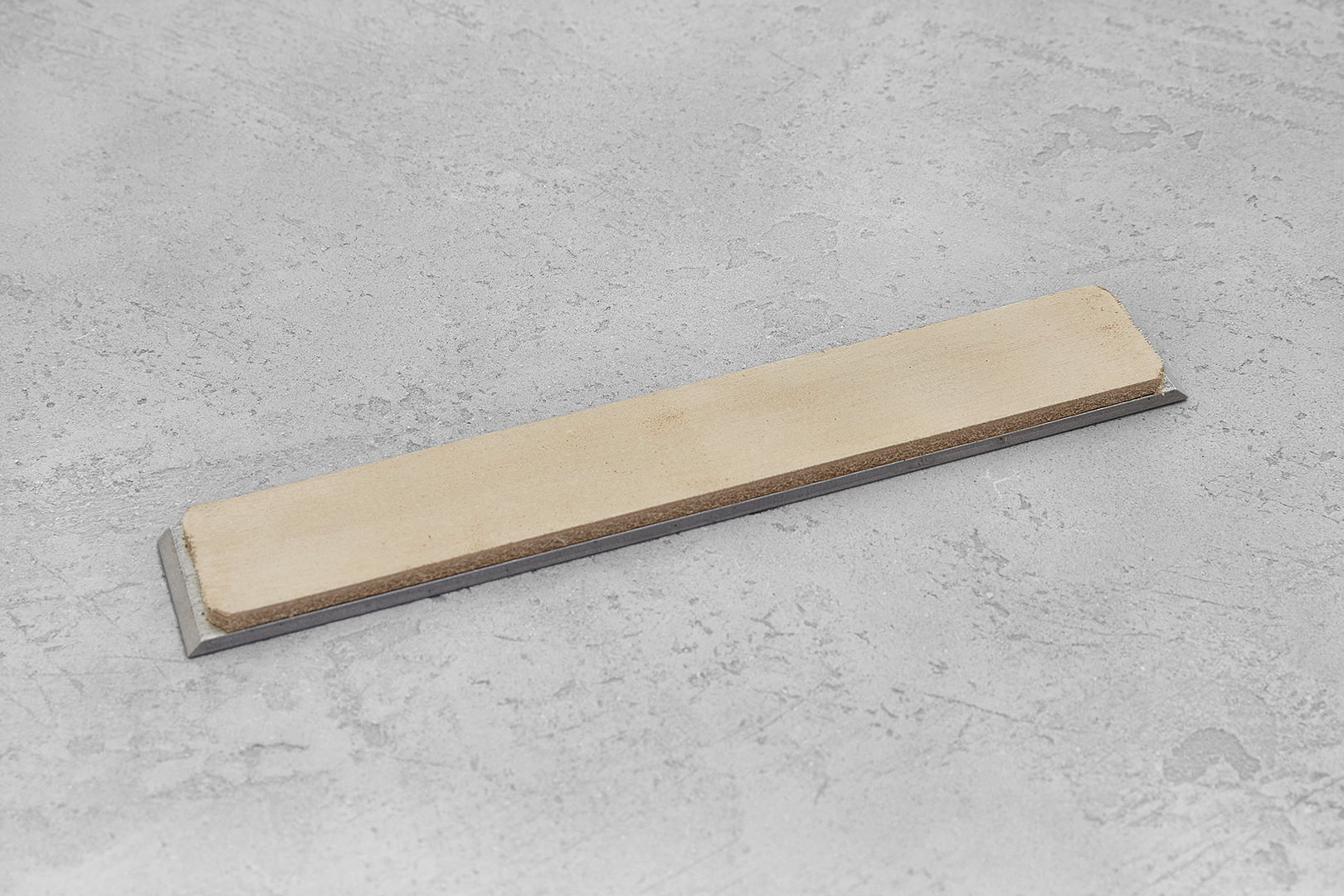 Бланк с кожей предназначен для финишной доводки режущей кромки ножа. Рабочая поверхность сделана из очень гладкой высококачественной коровьей кожи (юфть) толщиной 3 мм. Размер рабочей поверхности 150×25 мм.