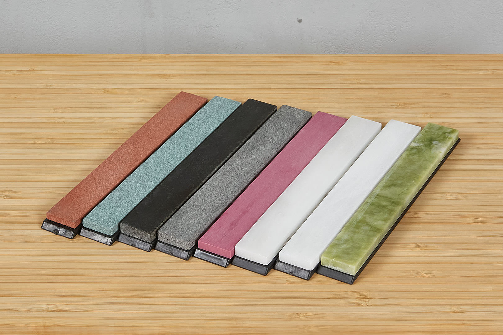 В набор входит 8 брусков размером 150×20×5,0 мм, наклеенных на пластиковые бланки. Зернистость камней в grit: