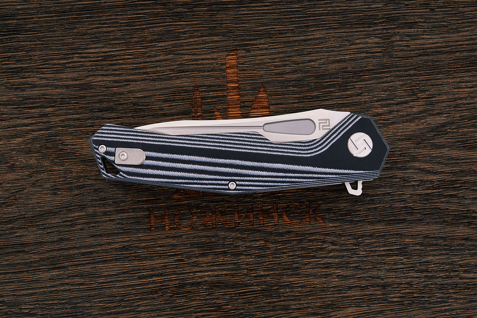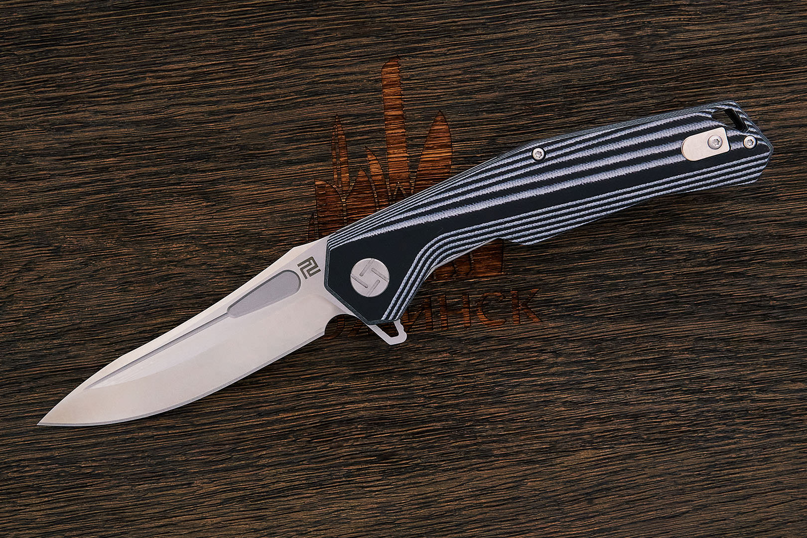 Artisan Cutlery Zumwalt имеет геометрический дизайн и конструкцию, которые обязательно произведут впечатление. Его угловатые контуры ручек G10 придают уникальный вид и хорошо ложатся в руку. Нож оснащен клинком формы drop point из инструментальной стали D2, который приятно контрастирует с дизайном рукоятки. В осевой узел установлен керамический подшипник. Механизм открывания – Flipper (плавник), позволяющий раскрыть нож одной рукой. Фиксируется нож в раскрытом состоянии замком типа LinerLock. Двухпозиционная клипса позволяет носить нож в любом кармане.