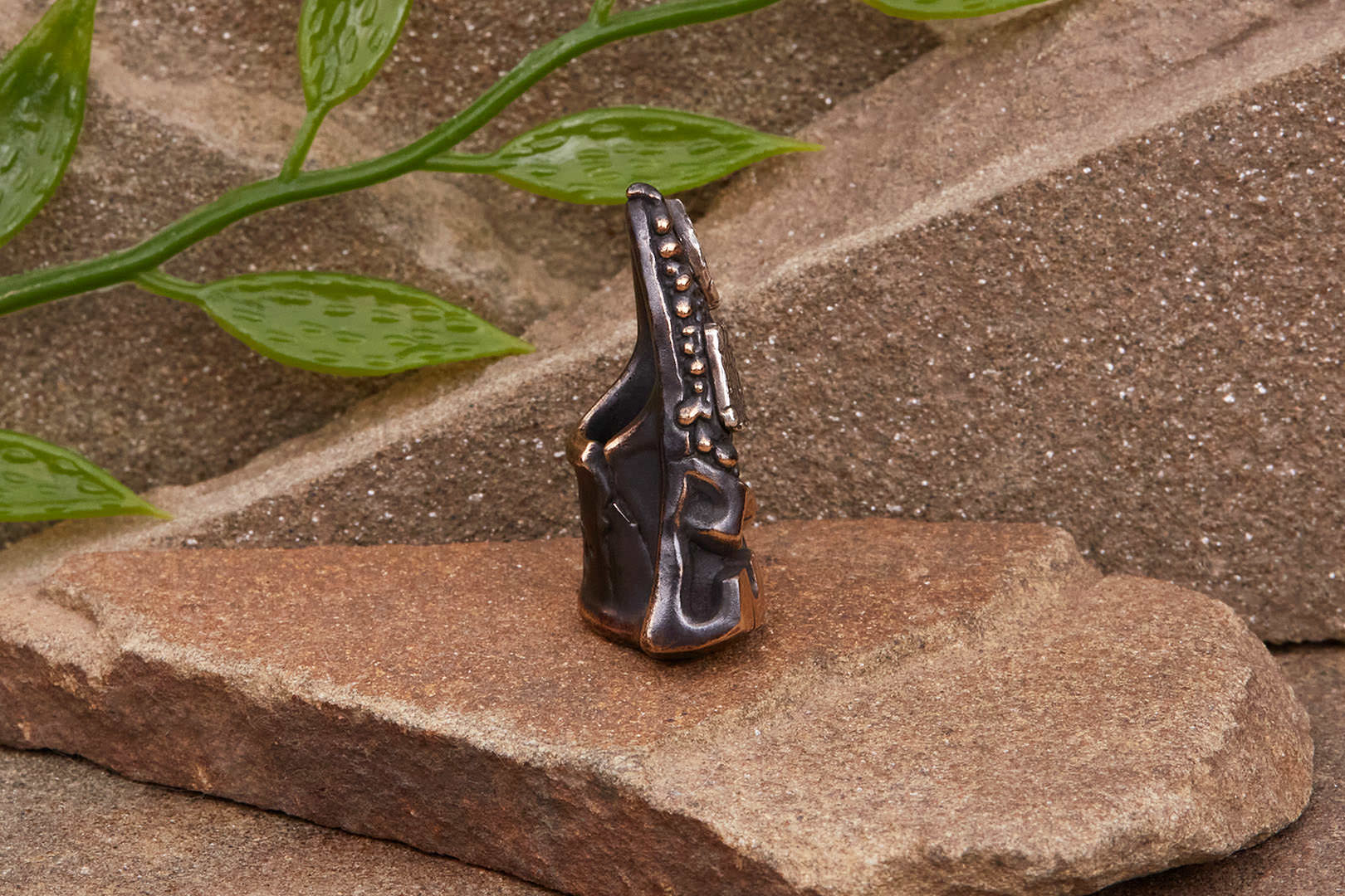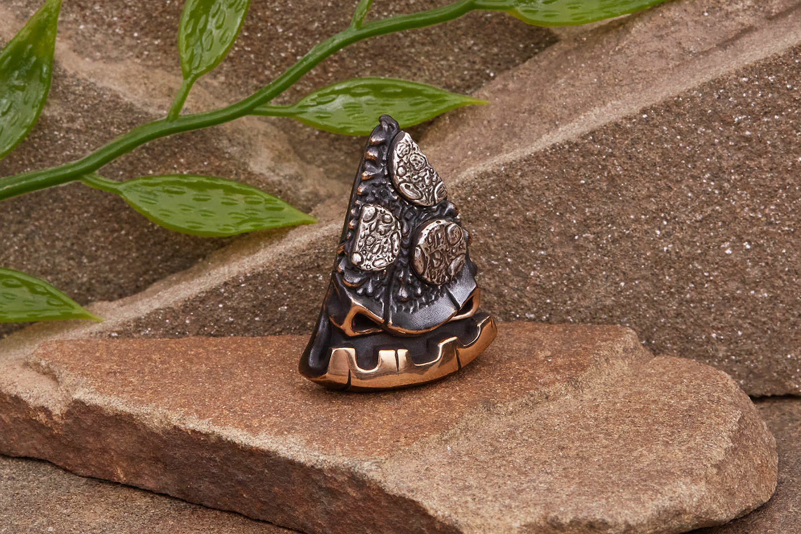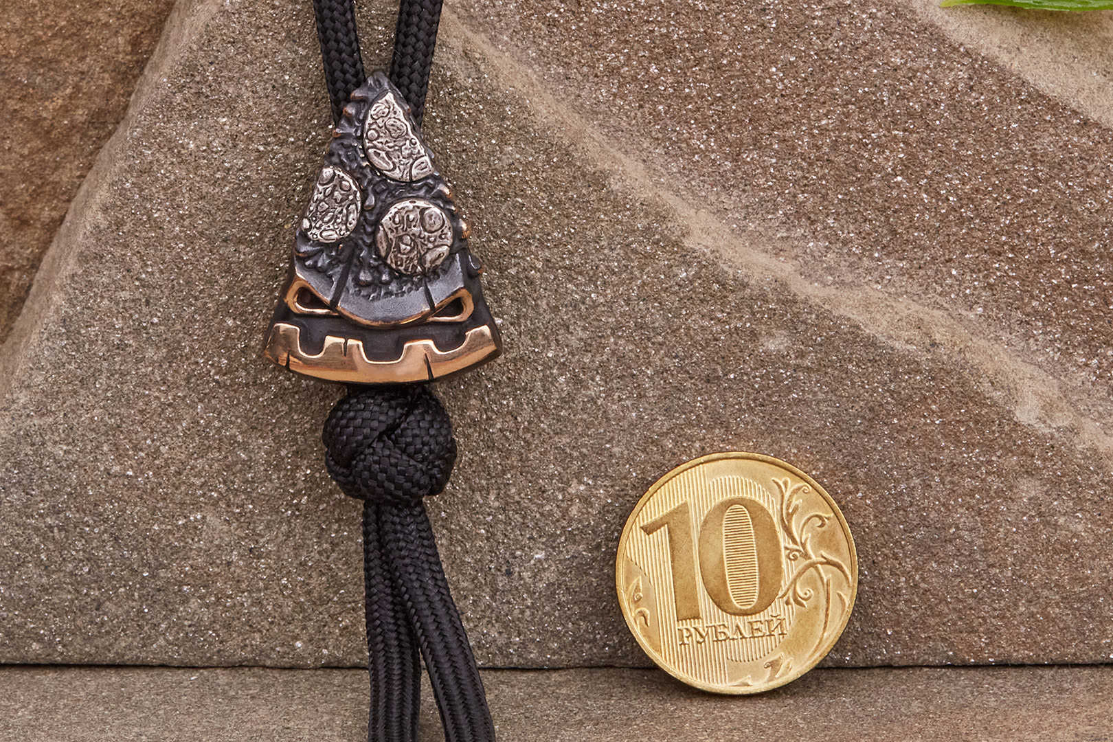 Авторская бусина "Пицца" с высокой детализацией от мастерской братьев Пешковых изготовлена из бронзы с тёмно-коричневой патиной и белого металла. Имеет следующие параметры: вес 14,8-15,2г, высота 28,0мм, ширина 21,5мм, диаметр отверстия 5,4мм.