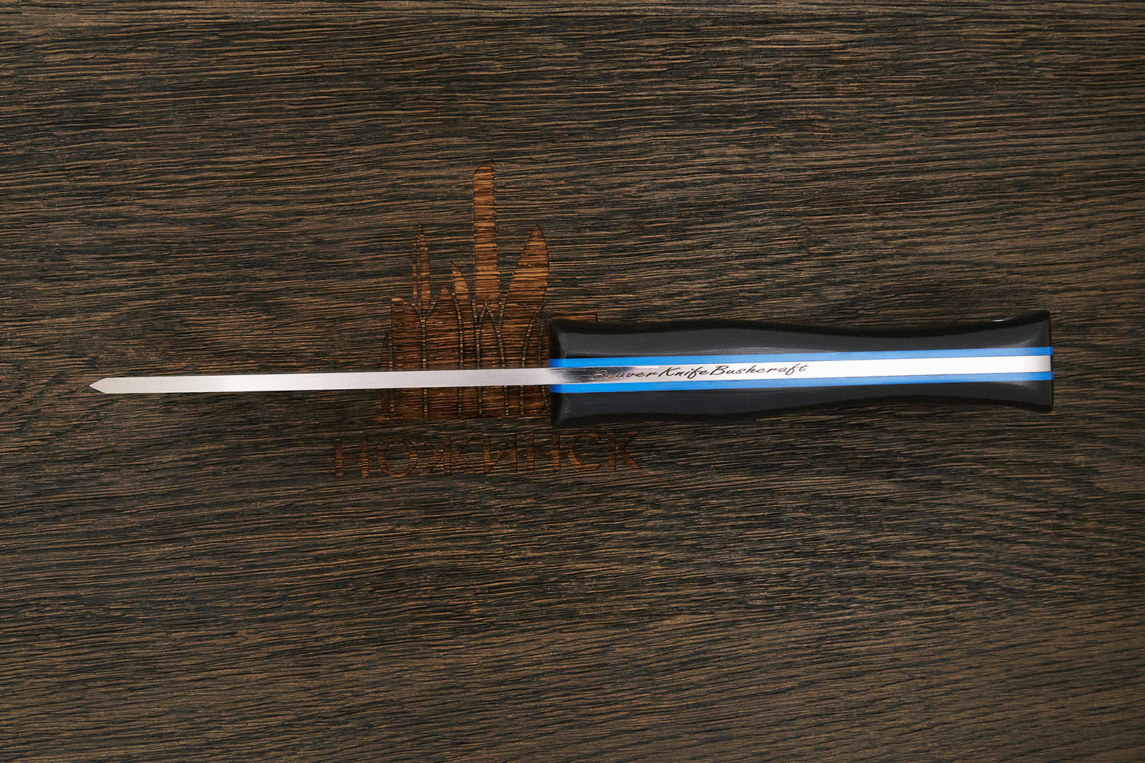 Нож среднего размера, созданный в концепции североамериканского бушкрафта, подразумевающей комфортное пребывание в суровых условиях дикой природы с минимумом инструмента. Клинок имеет среднюю длину и неагрессивный прочный кончик, подходящий для сверления дерева. Форма лезвия с выраженным «пузиком» хорошо подходит для разделки дичи, а скандинавские спуски обеспечивают контроль и удобство при строгании. Благодаря своей толщине и особенностям конструкции нож отлично переносит боковые и ударные нагрузки, что позволяет выполнять им все тяжелые работы по обустройству походного быта. Рукоятка достаточно крупная, плотно заполняет ладонь и, сужаясь в тыльной части, образует форму перевернутого конуса, который препятствует соскальзыванию руки при работе. В тыльной части выполнено отверстие под темлячный шнурок для удобства использования.