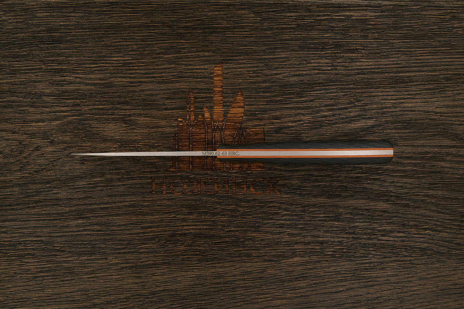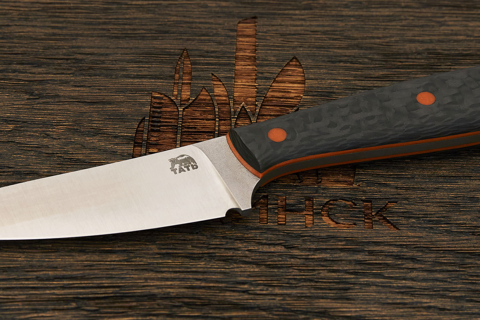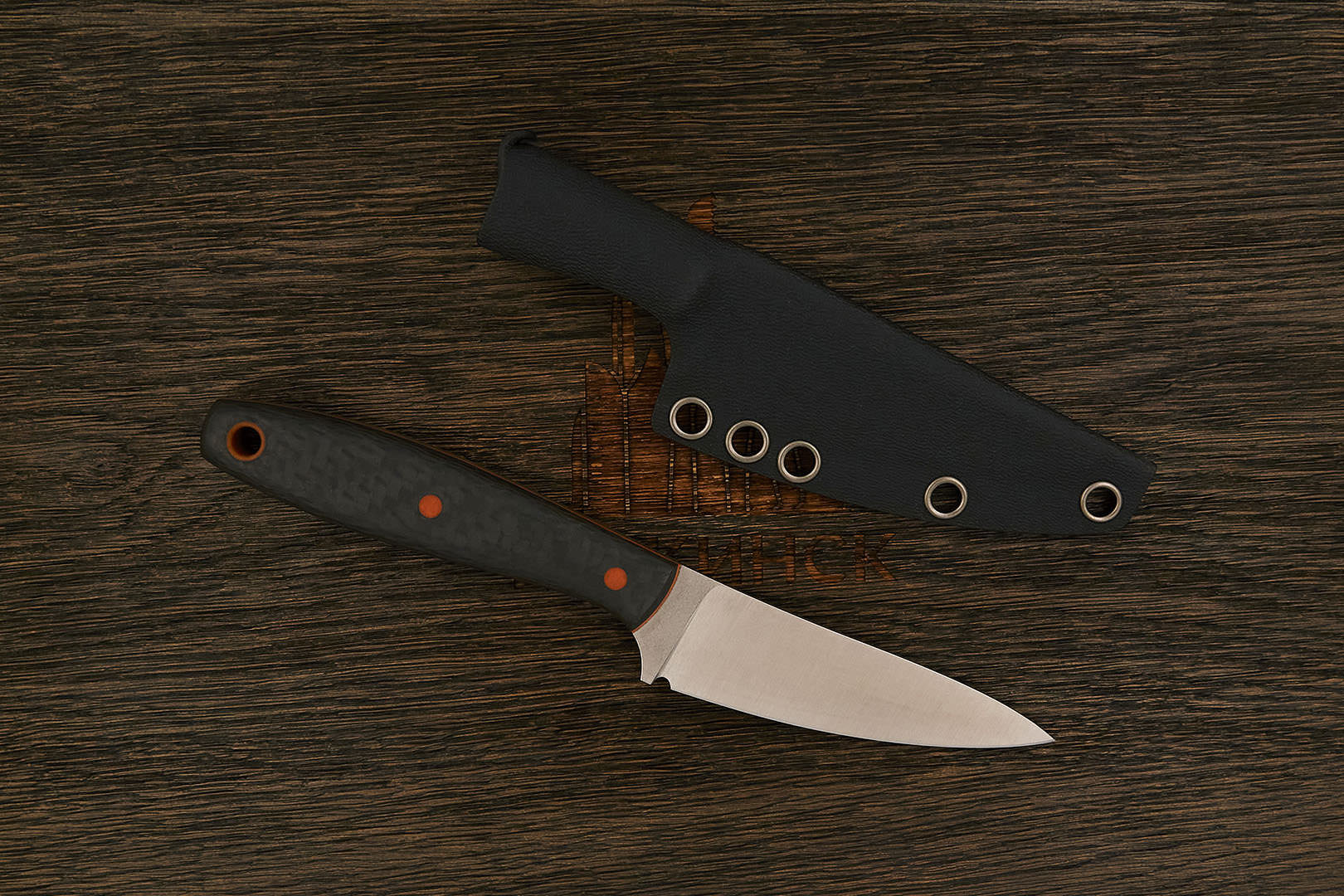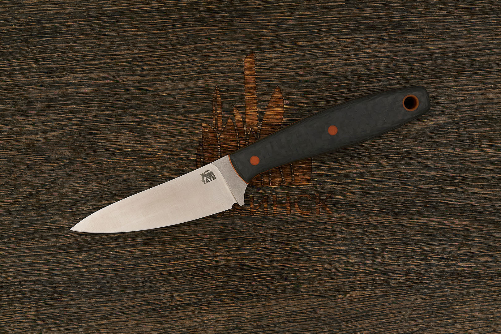 На сегодняшний день карбон один из лучших материалов для изготовления рукоятей ножей. Строгий по фактуре, нейтральный по цвету от светло-серого до почти черного, он практически не скользит в руке. Чрезвычайно прочный, абсолютно не впитывает ни воду, ни запахи, отлично переносит перепады влажности и температуры. Пожалуй, единственный его недостаток — сложная технология производства и, как следствие, высокая цена.