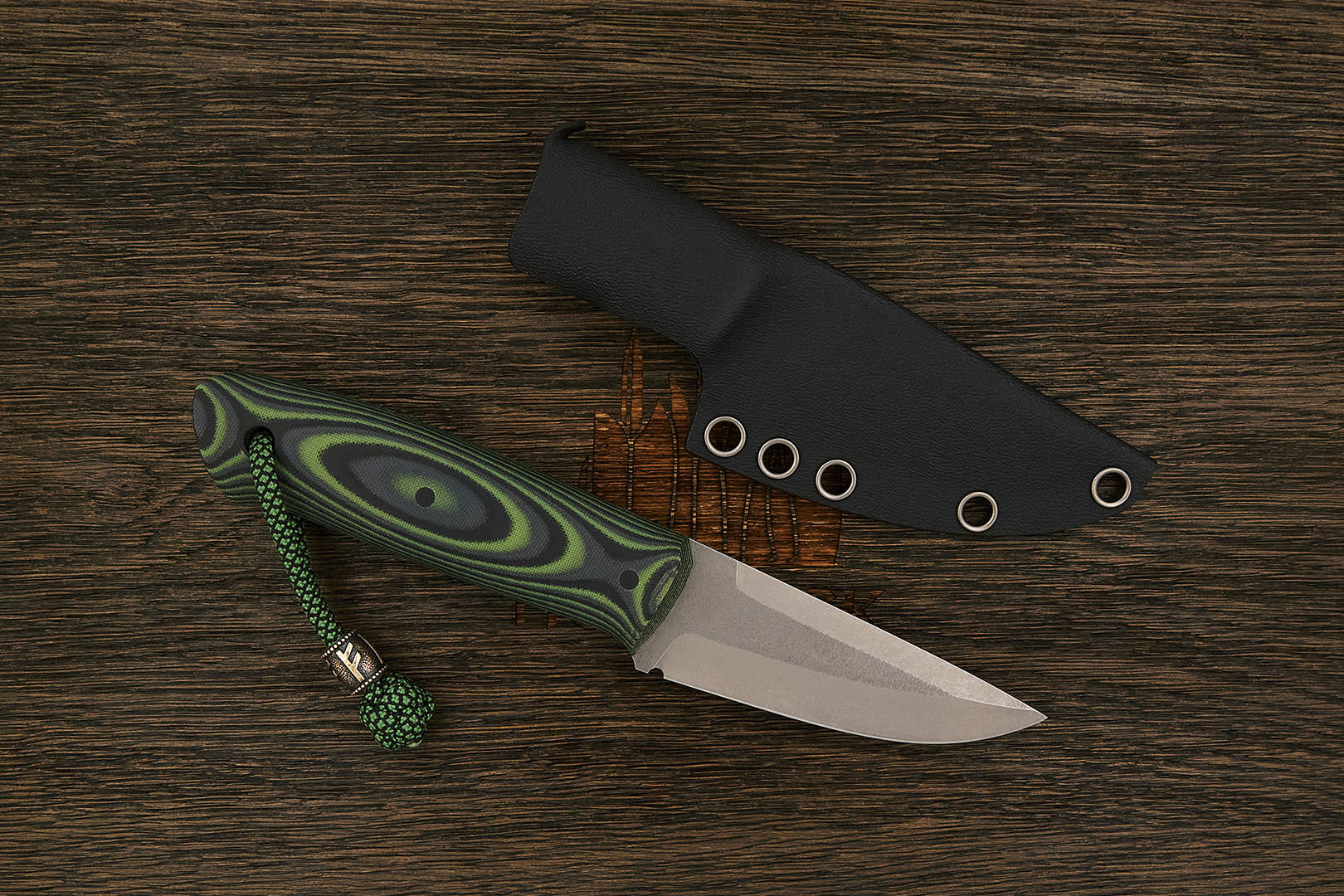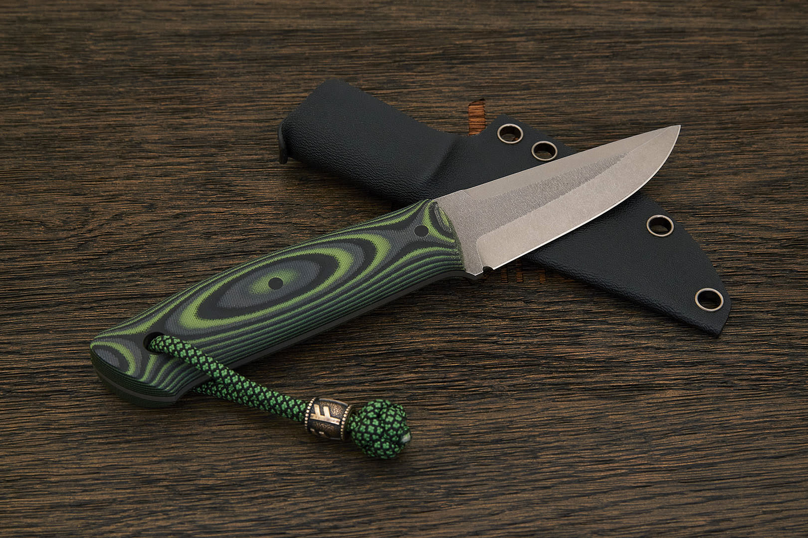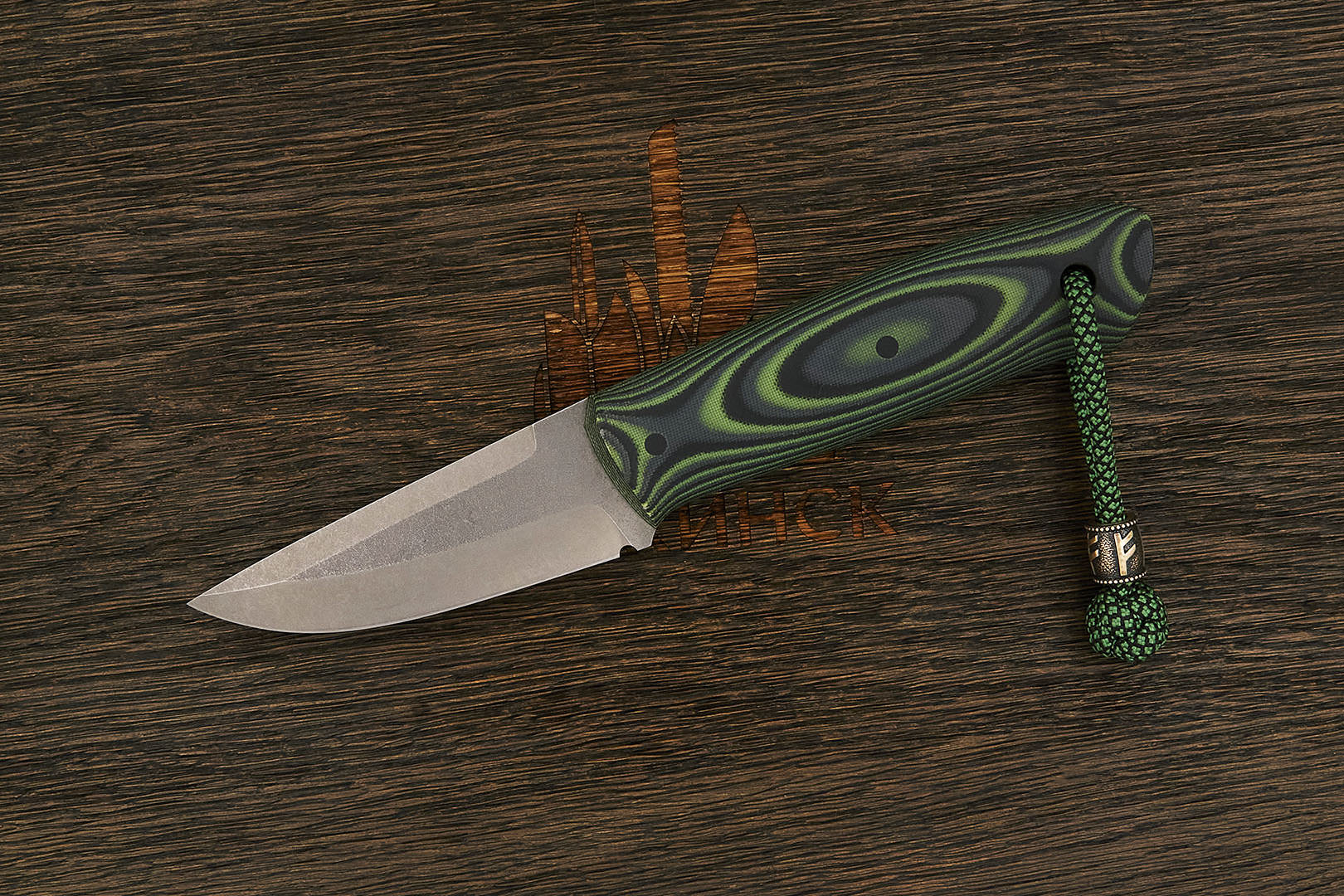 Микарта – очень прочный конструкционный материал, представляющий собой слоистый пластик на основе ткани и фенолформальдегидных или эпоксидных смол. Слои ткани пропитываются и склеиваются под высоким давлением и температурой. Благодаря совокупности потребительских свойств micarta (текстолит) прекрасно подходит для изготовления рукоятей ножей. Прочная, не впитывает ни воду, ни запахи, тактильная и высоко декоративная за счет разнообразия текстур и цветов. По теплопроводности микарта близка к натуральному дереву, что позволяет достаточно комфортно использовать ножи на сильном морозе.