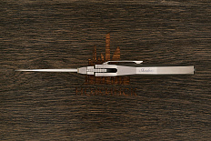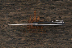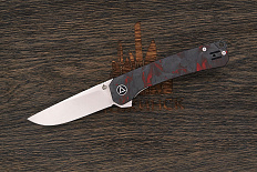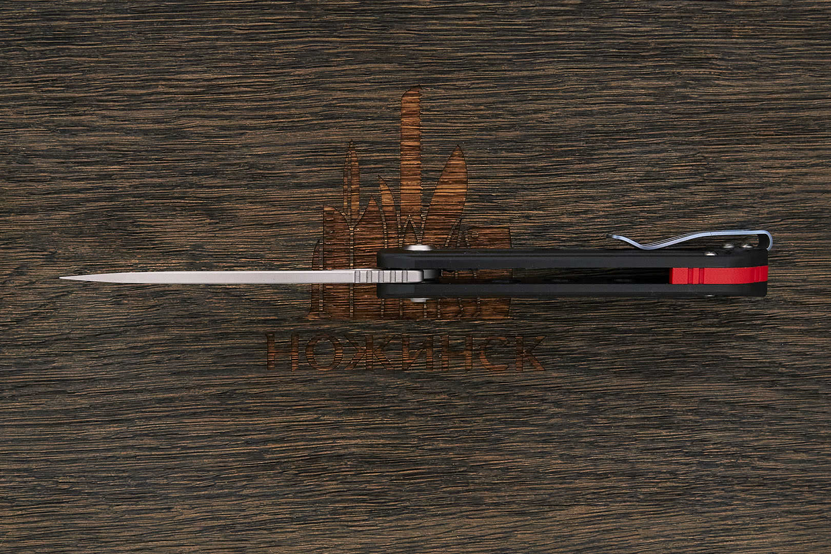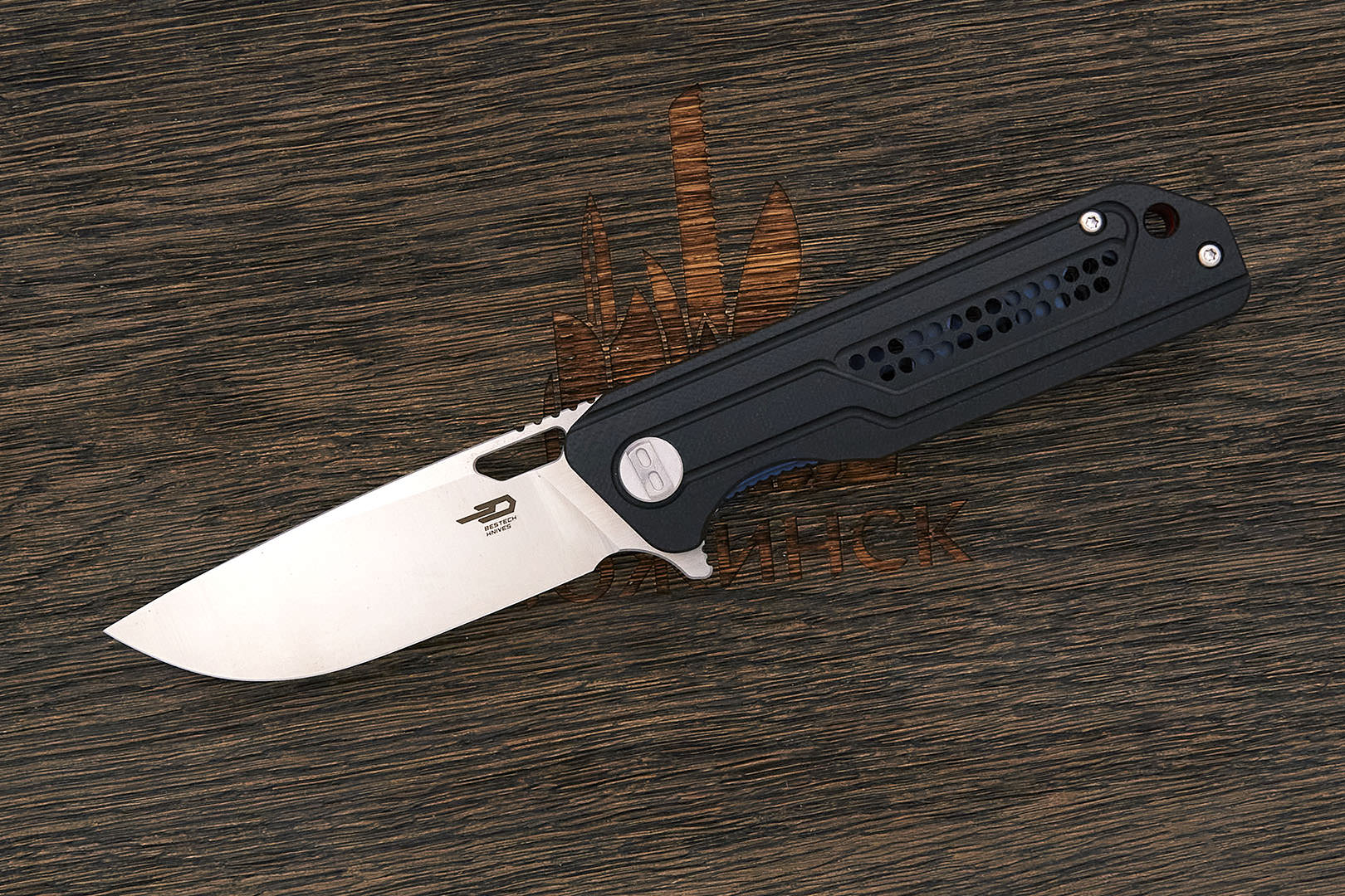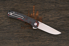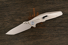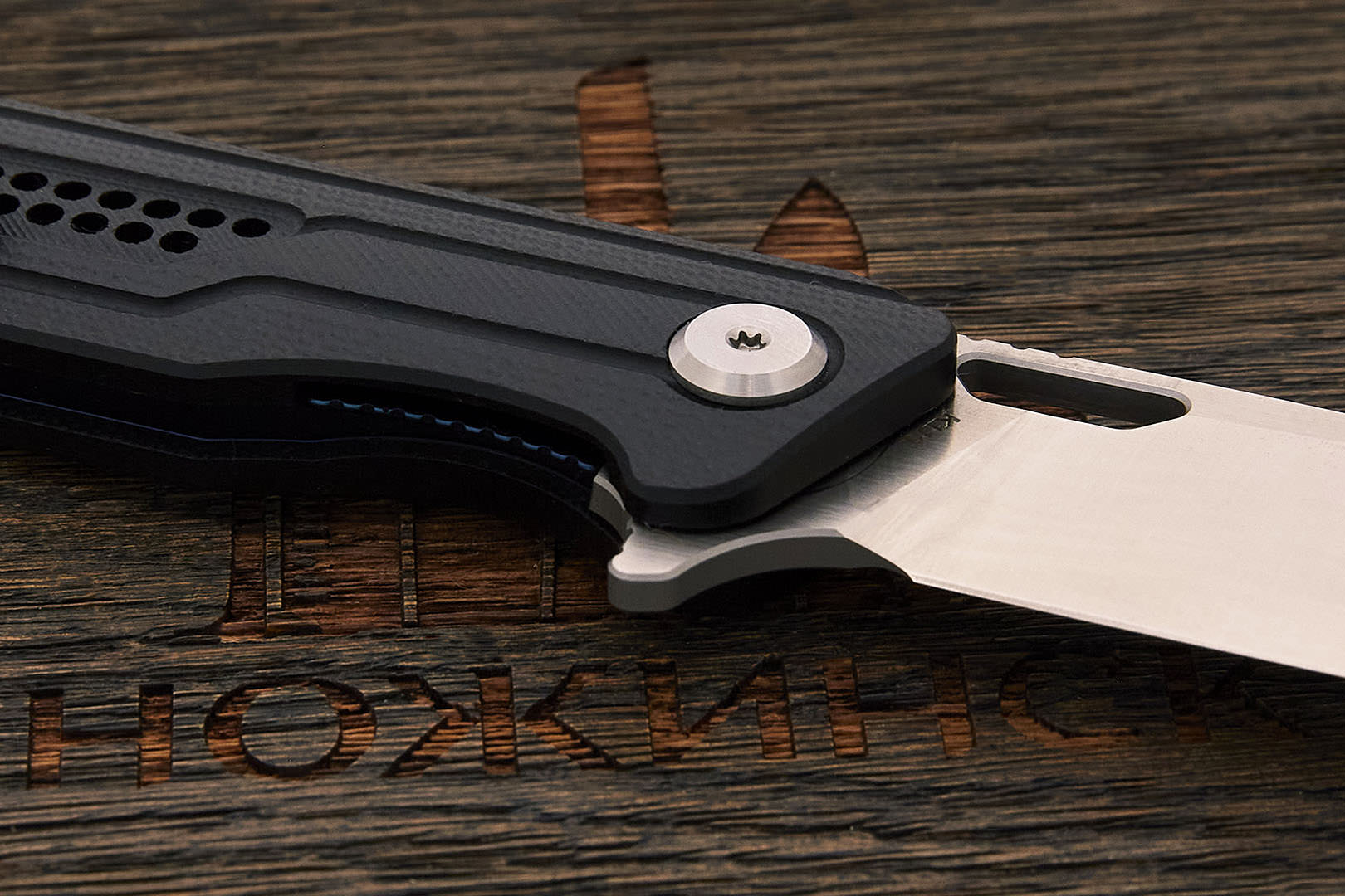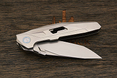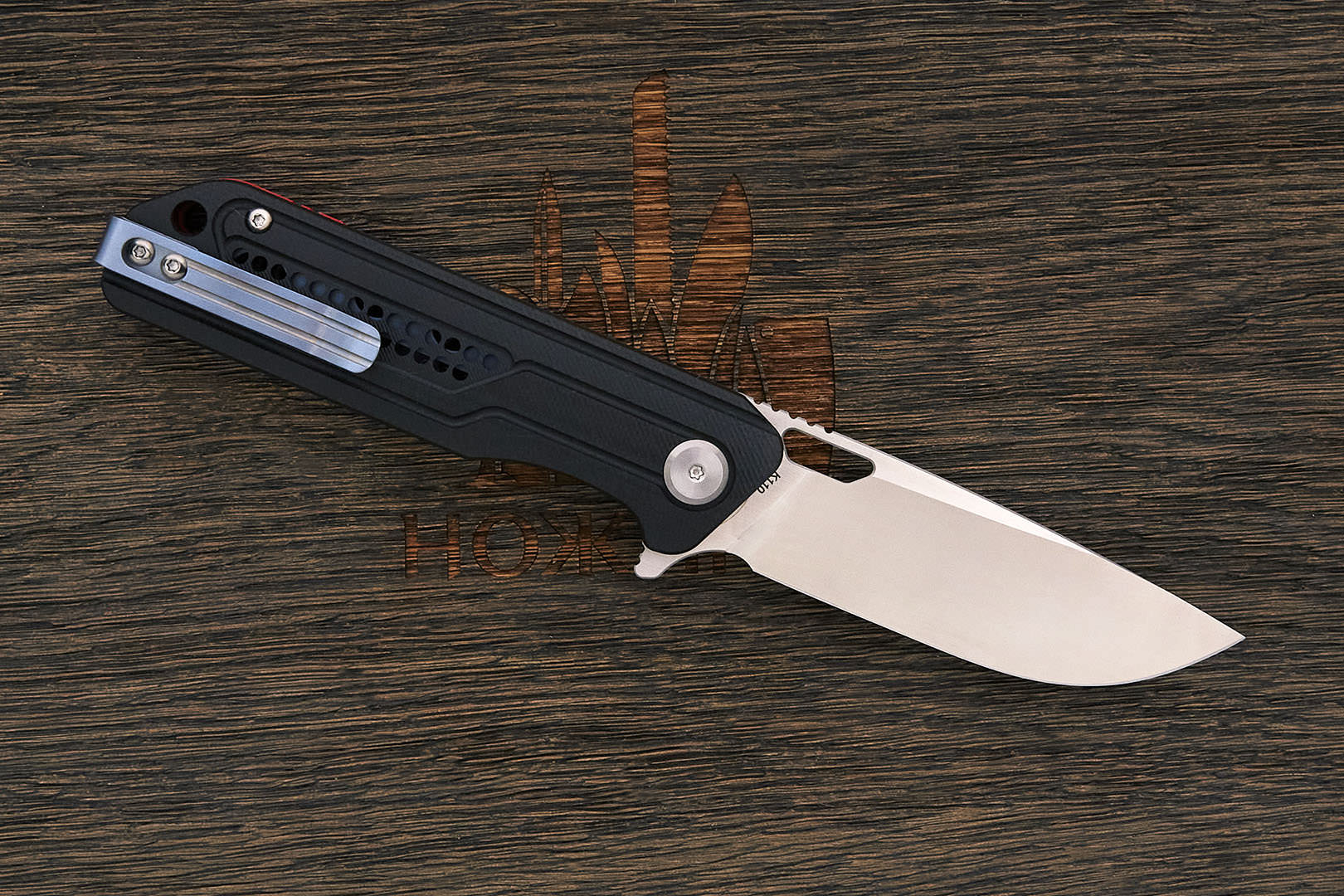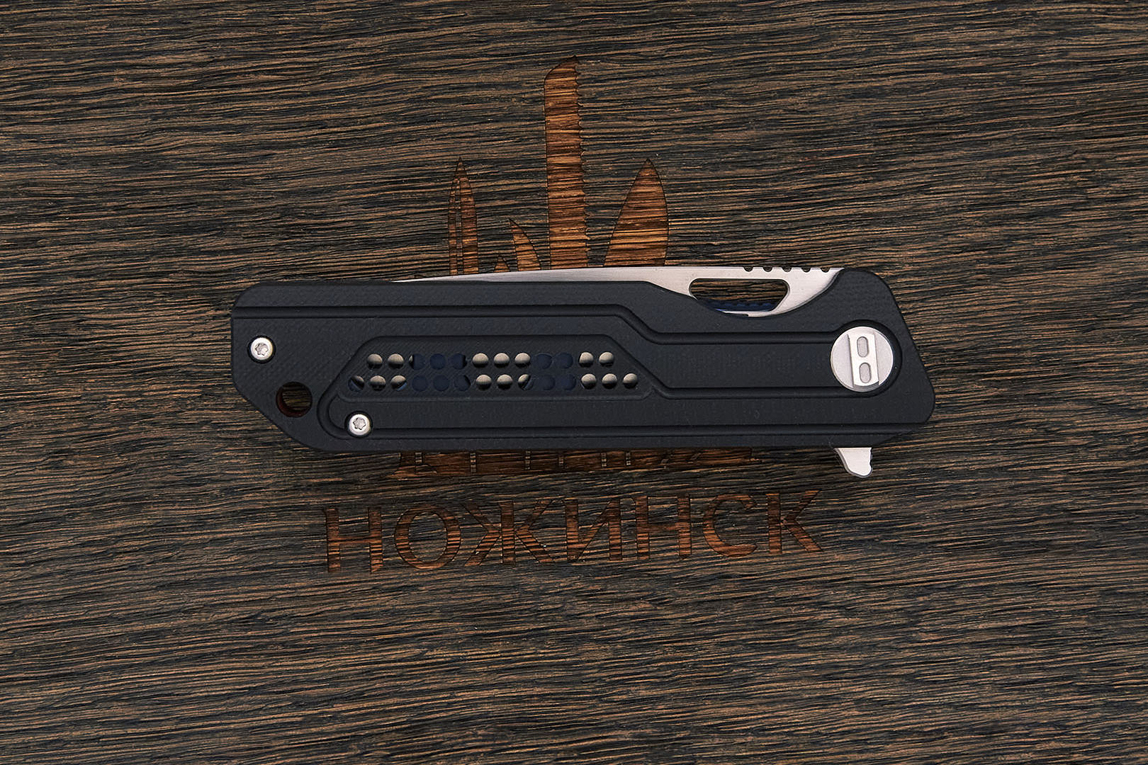 Компактный складной нож для решения повседневных задач. Небольшой клинок с формой drop point имеет плавный спуск обуха и высокие спуски лезвия, придающими отличные проникающие свойства при резе различных материалов или продуктов. На обухе выполнена насечка для упора пальцем при работе. В ноже реализована возможность однорукого открывания, которая представлена двумя вариантами: за отверстие неправильной формы в голомени и за плавник, в закрытом состоянии выступающий над спинкой рукоятки. Осевой узел оборудован керамическими подшипниками, обеспечивающими плавный и легкий ход. За фиксацию клинка отвечает механизм liner lock с установленным шариком детента, препятствующим случайному выбрасыванию при ношении. Рукоятка имеет прямую форму и выполнена в виде текстурированных накладок с перфорацией, лайнеры несущей конструкции также имеют перфорацию для снижения веса и анодирование.  Нож оборудован односторонней клипсой глубокой посадки и отверстием для темлячного шнура.