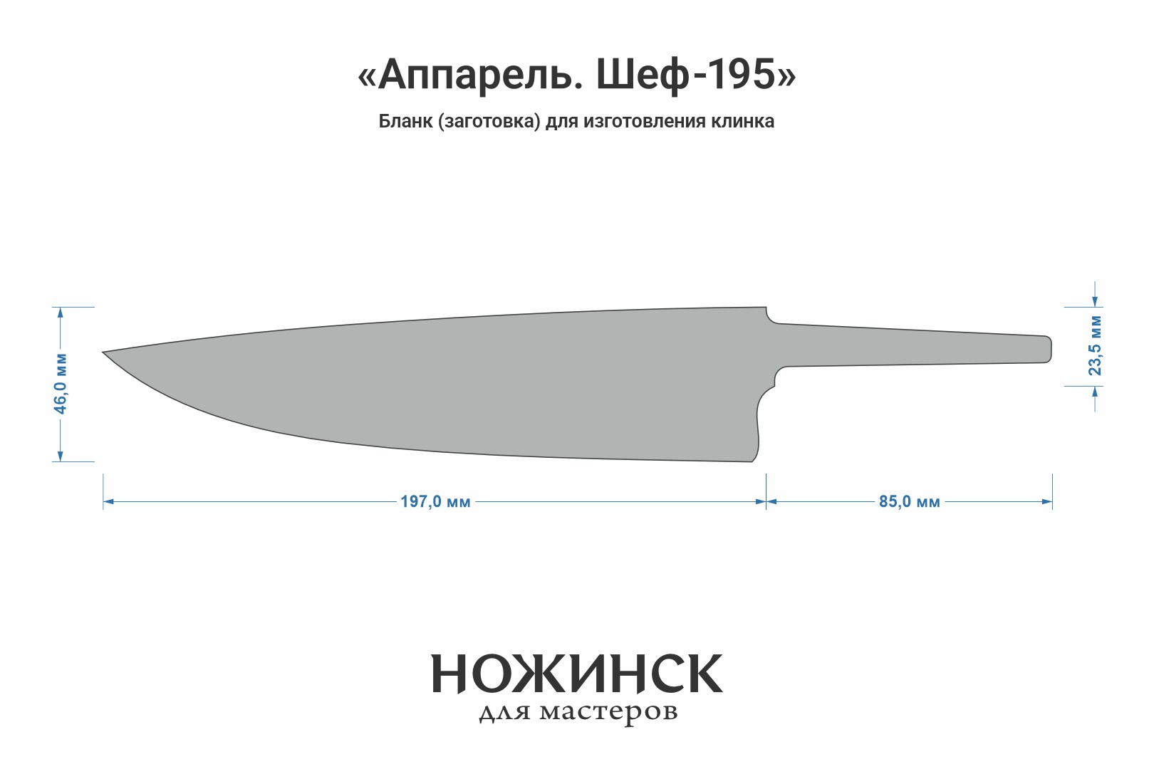 Размеры бланка: длина клинковой части 197мм (1-2 мм предусмотрены для посадки больстера), ширина 46мм, длина хвостовика 85мм.