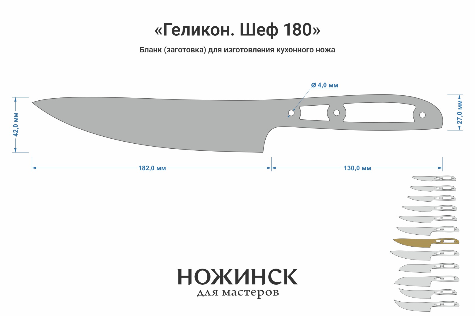 Размеры бланка: длина клинковой части 182мм, ширина 42мм (1мм предусмотрен на контуровку), общая длина заготовки 312мм.