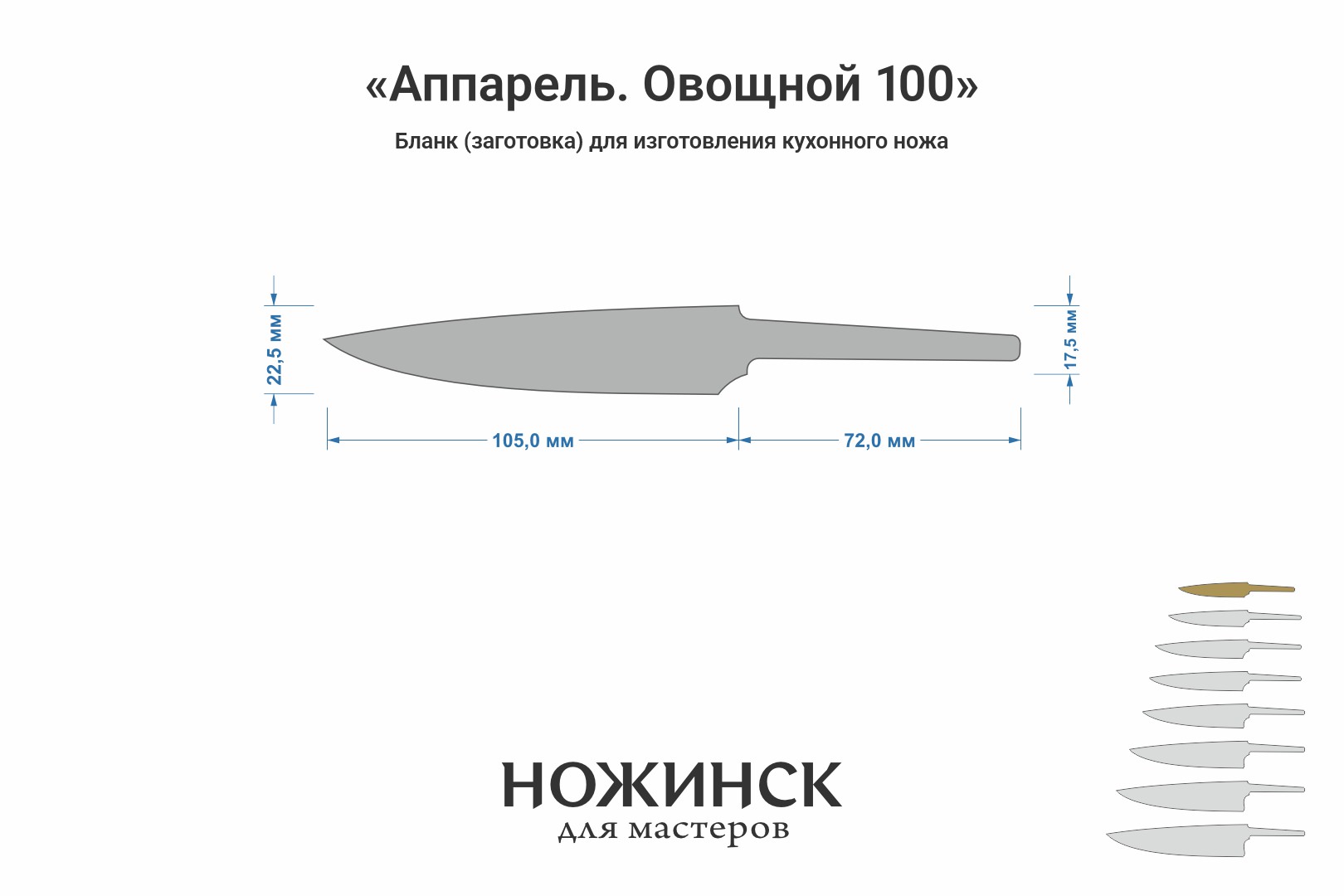 Размеры бланка: длина клинковой части 105мм (предусмотрена глубокая посадка в больстер), ширина 22,5мм, длина хвостовика 72мм.
