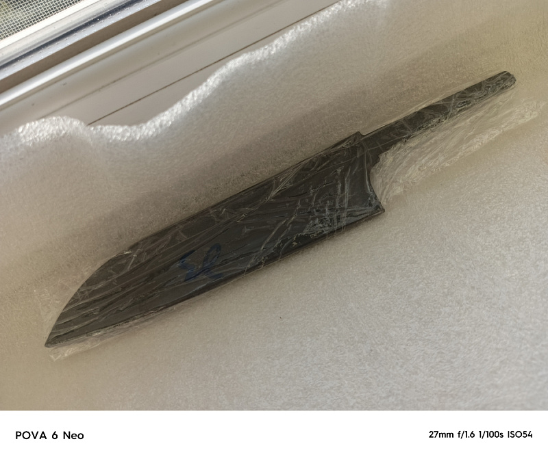 Бланк-заготовка для кухонного ножа «Геликон С180» из листового проката порошковой стали Elmax шведской компании Uddeholm, вырезан методом гидроабразивной резки.