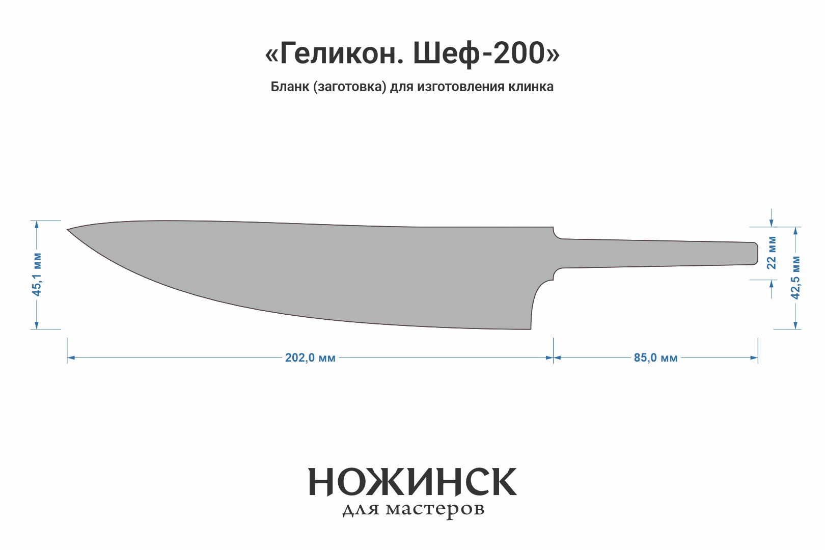 Размеры бланка: длина клинковой части 202мм (1-2 мм предусмотрены для посадки больстера), ширина 42,5мм, длина хвостовика 85мм.