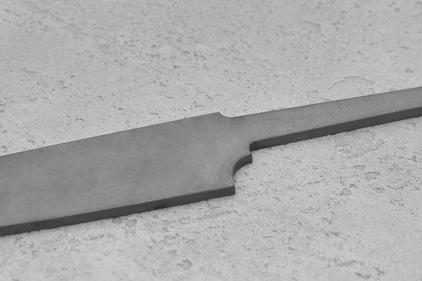 Бланк-заготовка для кухонного ножа «Аппарель У135» из листового проката порошковой стали JM390A (идентичной M390), изготовлен методом гидроабразивной резки.
