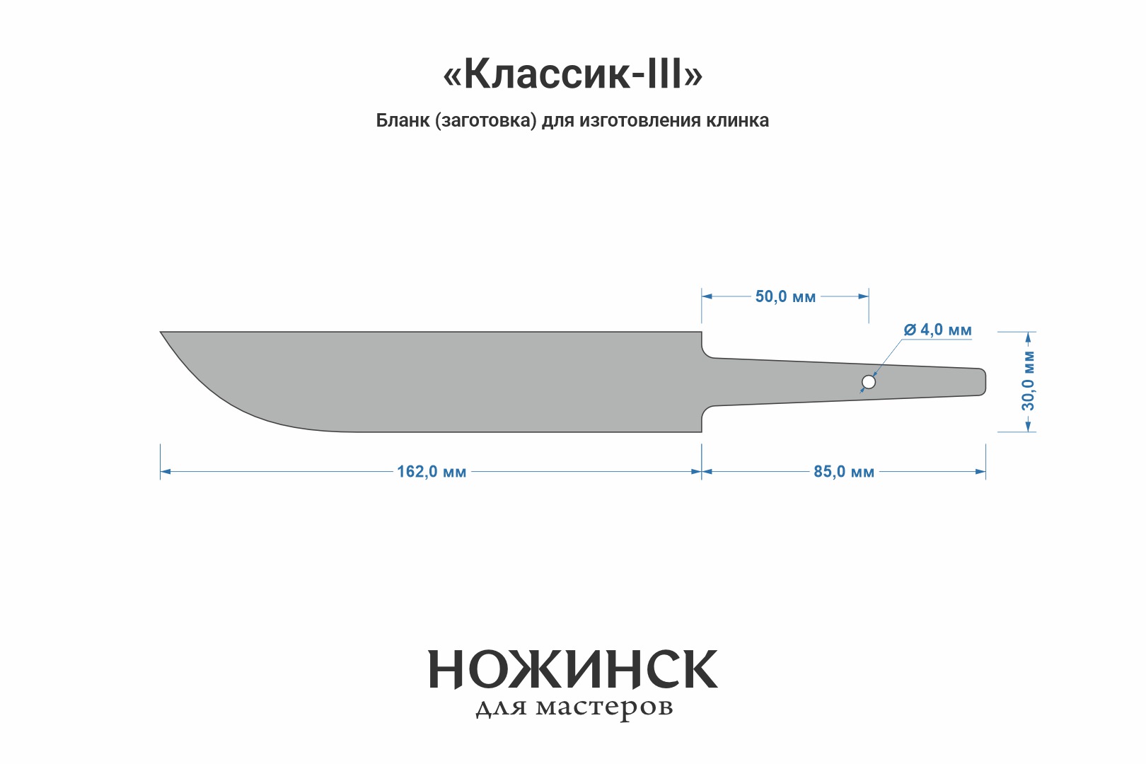 Размеры бланка: длина клинковой части 162мм (1-2 мм предусмотрены для посадки больстера), ширина 30мм, длина хвостовика 85мм, диаметр отверстия 4мм.