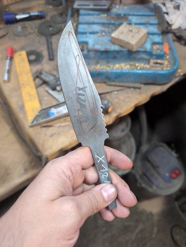 Бланк-заготовка для ножа «Боуи-III» из листового проката стали Х12МФ, изготовлен методом гидроабразивной резки.