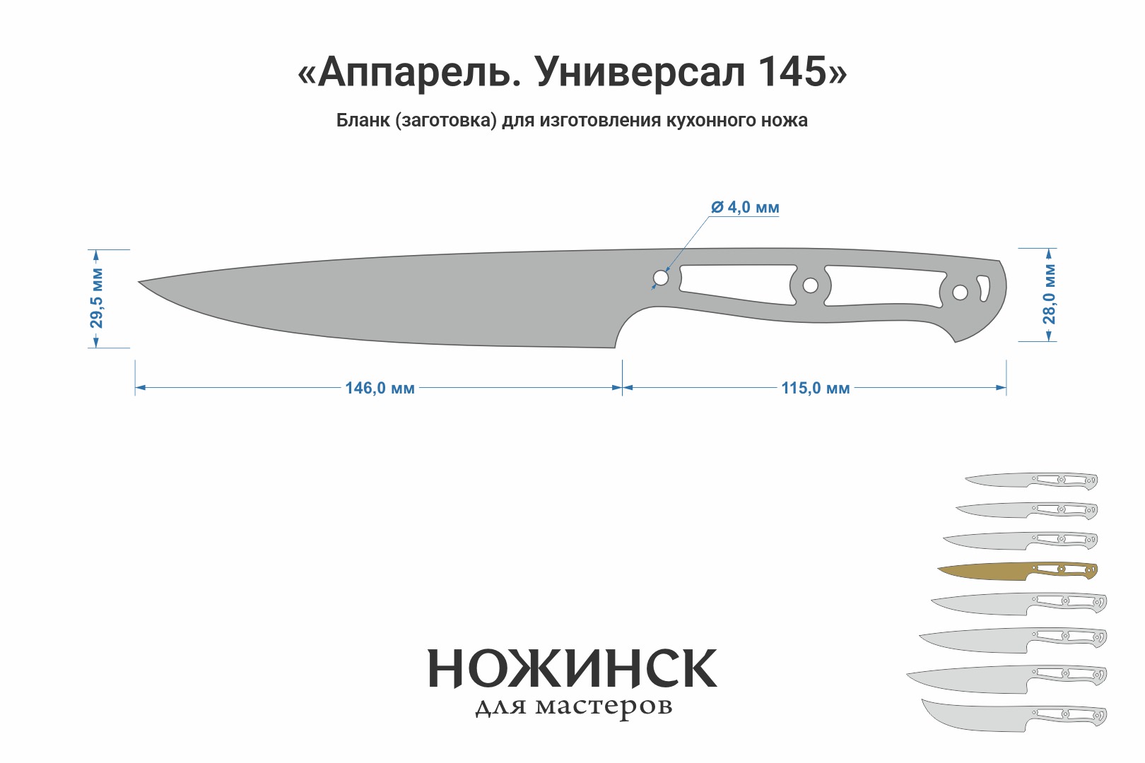 Размеры бланка: длина клинковой части 146мм, ширина 29,5мм (1мм предусмотрен на контуровку), общая длина заготовки 261мм.