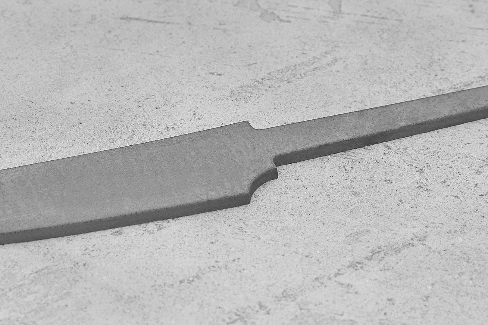Бланк-заготовка для кухонного ножа «Геликон О110» из листового проката порошковой стали MagnaCut китайского завода специальных сталей TG (Tiangong Tools), вырезан методом гидроабразивной резки.