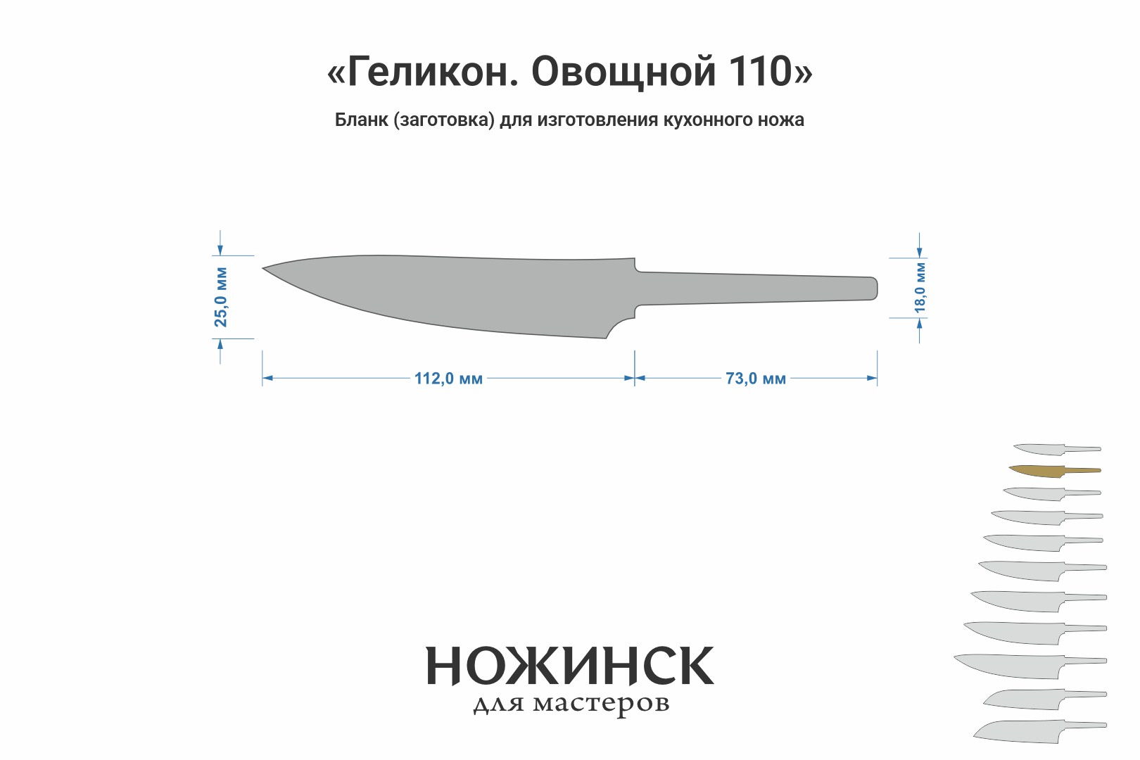 Размеры бланка: длина клинковой части 112мм (предусмотрена глубокая посадка в больстер), ширина 25мм, длина хвостовика 73мм.