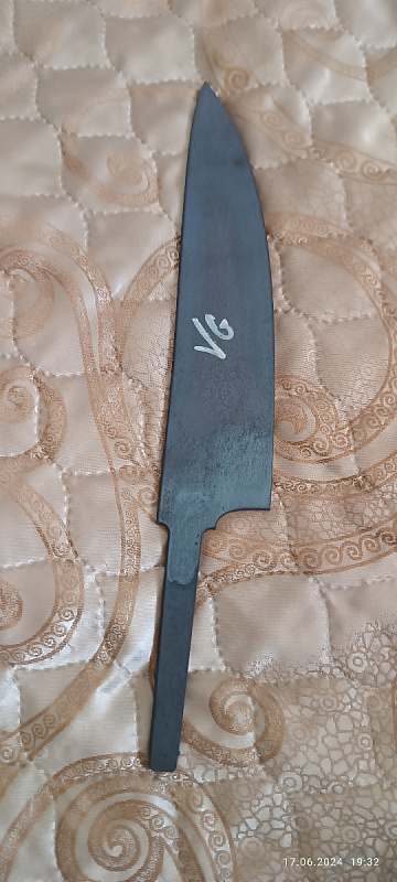 Бланк-заготовка для кухонного ножа «Геликон Ш200» из листового проката стали VG-10 Cobalt производства Ahonest Changjiang, вырезан методом гидроабразивной резки.