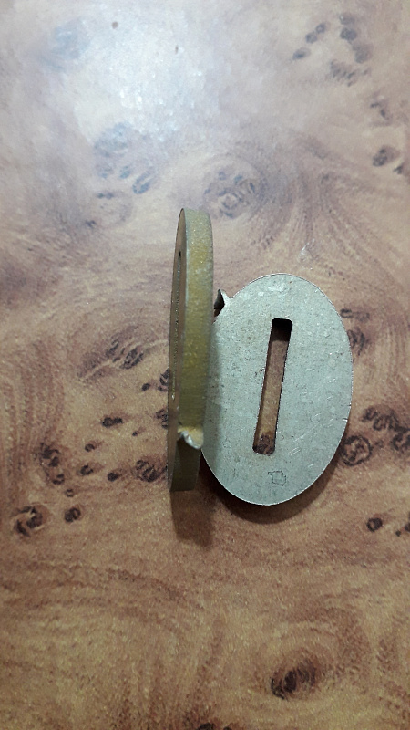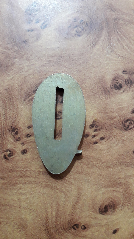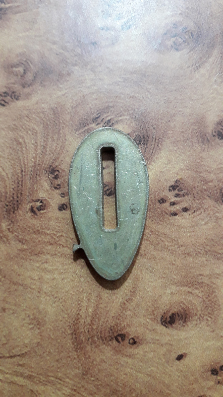 размер монтажного отверстия - 18,0×2,6-2,8 мм. Отступ от верха (обуха) 5,0 мм. Для удобства подгонки к клинку отверстие чуть клиновидно по толщине.