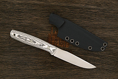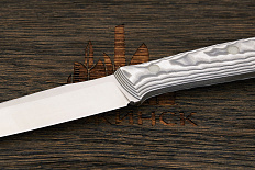 Микарта – очень прочный конструкционный материал, представляющий собой слоистый пластик на основе ткани и фенолформальдегидных или эпоксидных смол. Слои ткани пропитываются и склеиваются под высоким давлением и температурой. Благодаря совокупности потребительских свойств micarta (текстолит) прекрасно подходит для изготовления рукоятей ножей. Прочная, не впитывает ни воду, ни запахи, тактильная и высоко декоративная за счет разнообразия текстур и цветов. По теплопроводности микарта близка к натуральному дереву, что позволяет достаточно комфортно использовать ножи на сильном морозе.