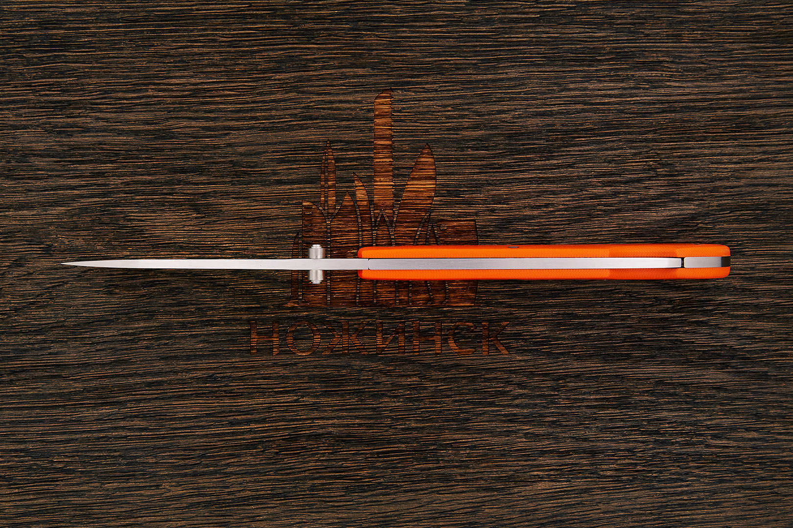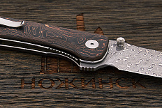 Клинок этого ножа в форме Drop-Point сделан из коррозионностойкой стали марки 440C, твердость которой по шкале Роквелла составляет 55-57 единиц по шкале HRC. Рукоять состоит из стальных лайнеров и накладок из стеклотекстолита G-10. Она имеет удобную форму с подпальцевыми углублениями.