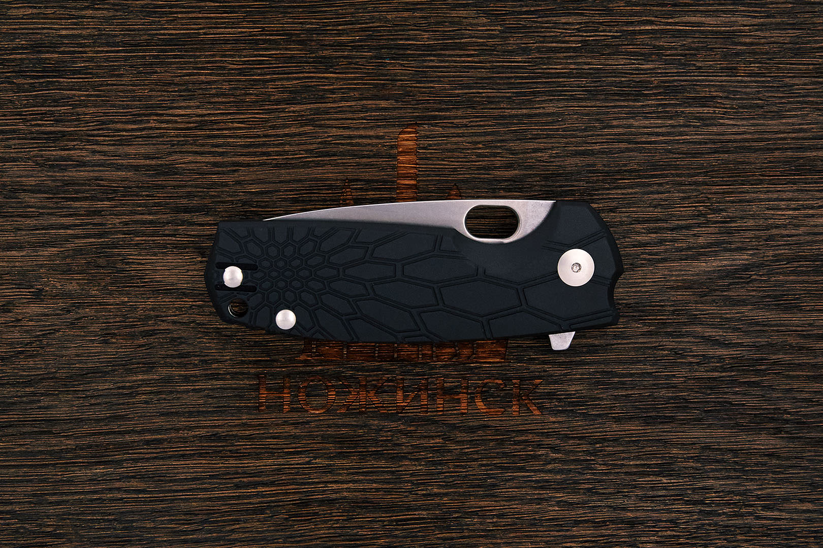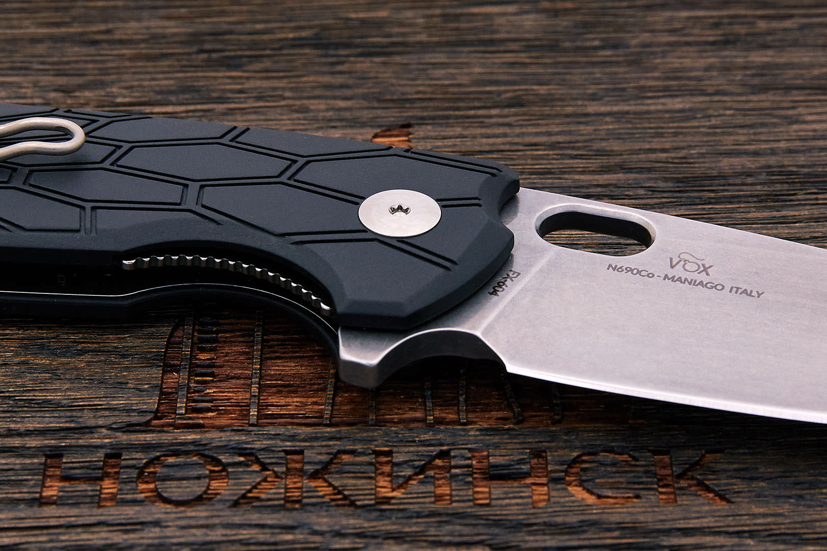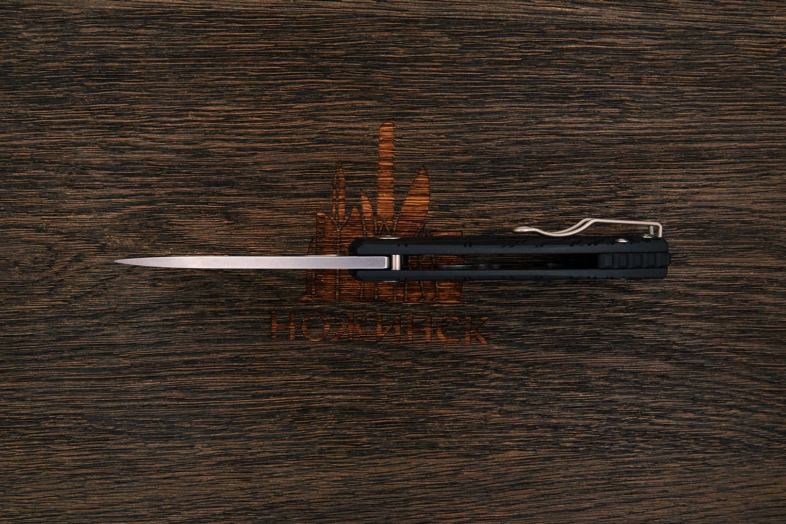Клинок изготовлен из стали N690Co, которая прекрасно сопротивляется различным агрессивным средам. Тип сечения – прямые спуски от голомени. Открывается клинок удобно – одним пальцем за плавник, как и многие другие
