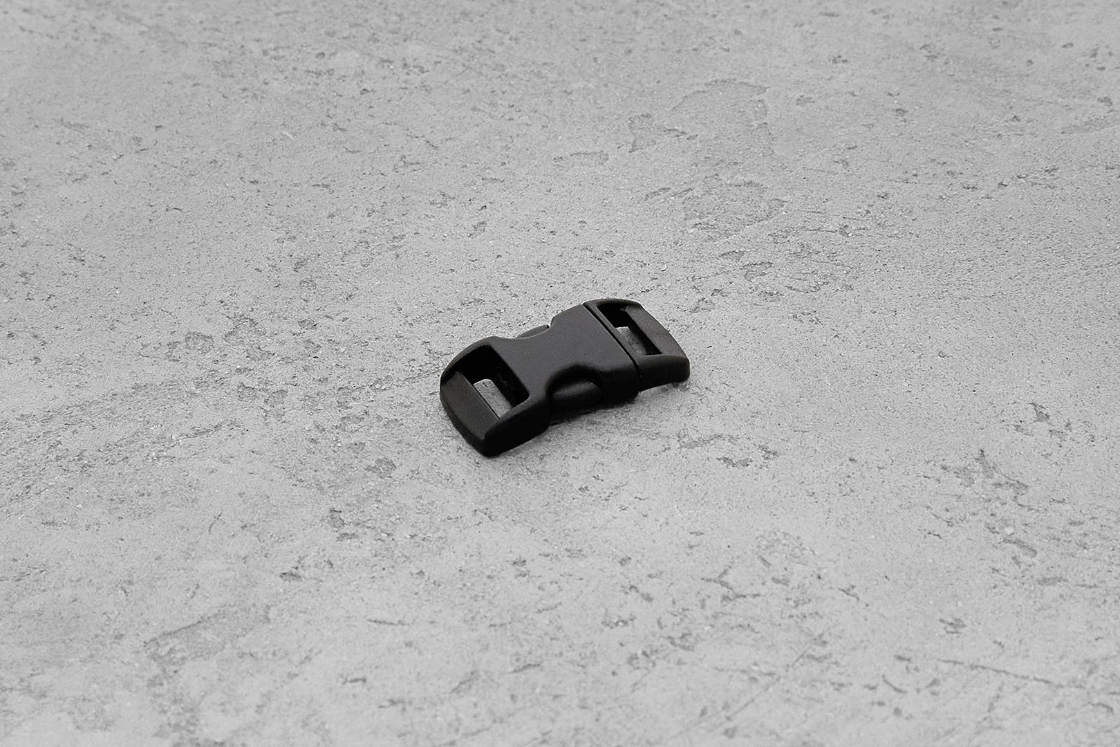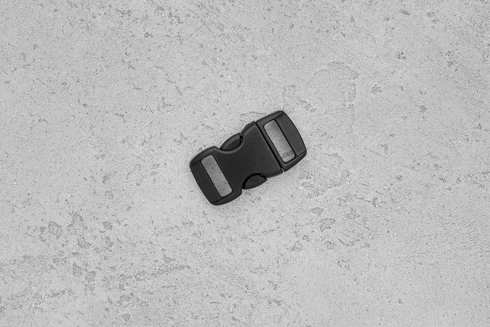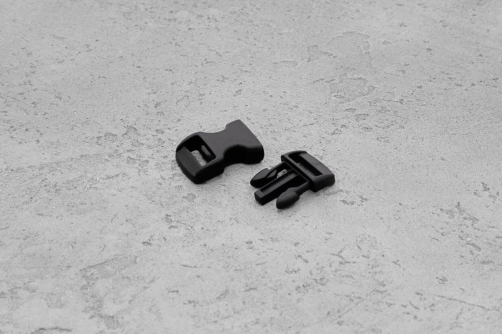 Застежка-фастекс изготовлена из чёрного пластика. Максимальные внешние габариты 15×30 мм, оба отверстия для крепления размером 3,5×10,5 мм. Для удобства ношения застежка имеет легкий прогиб.