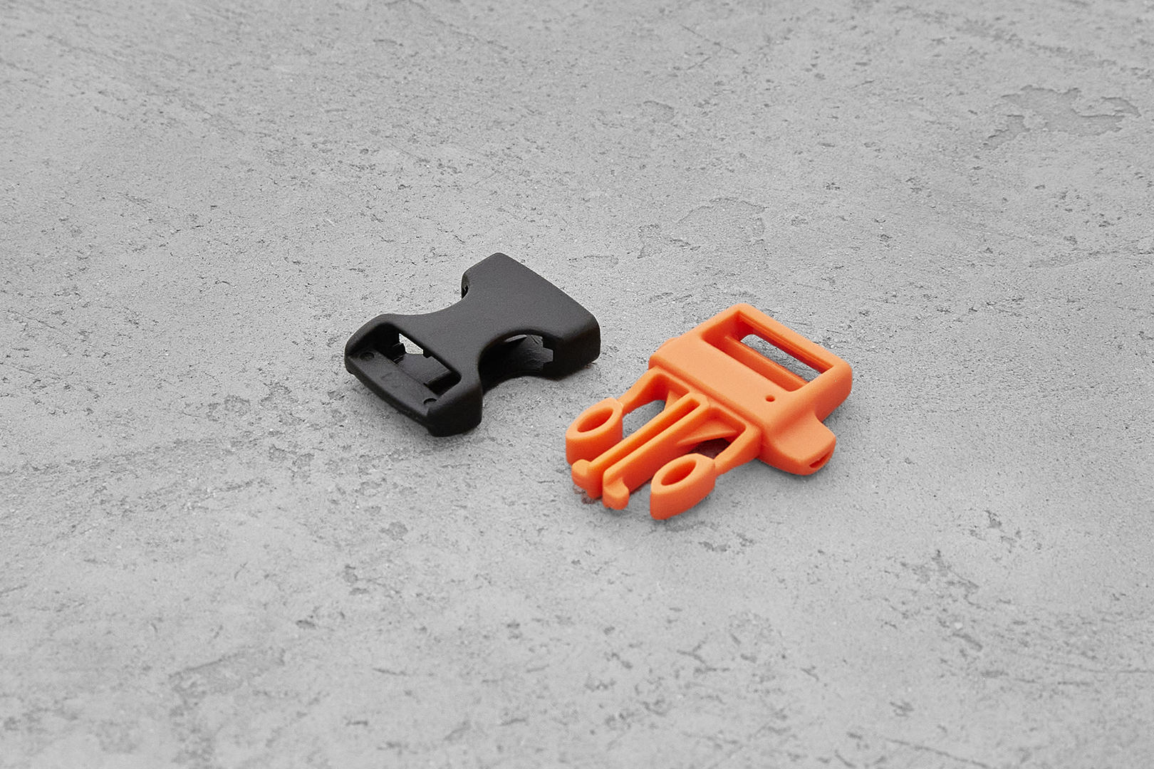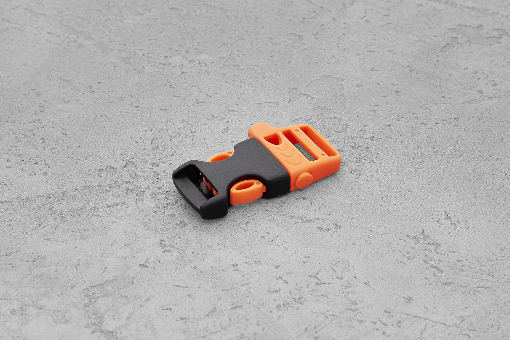 Прямая застежка-фастекс изготовлена из чёрного и оранжевого пластика. Максимальные внешние габариты (22+6)×50 мм, одиночное отверстия для крепления размером 3,0×16 мм, спаренное (3,0+3,0)×16 мм. В застежке предусмотрен свисток.