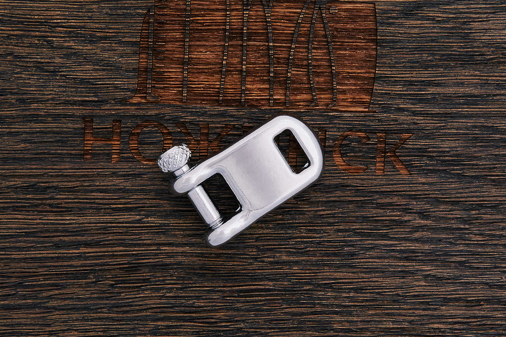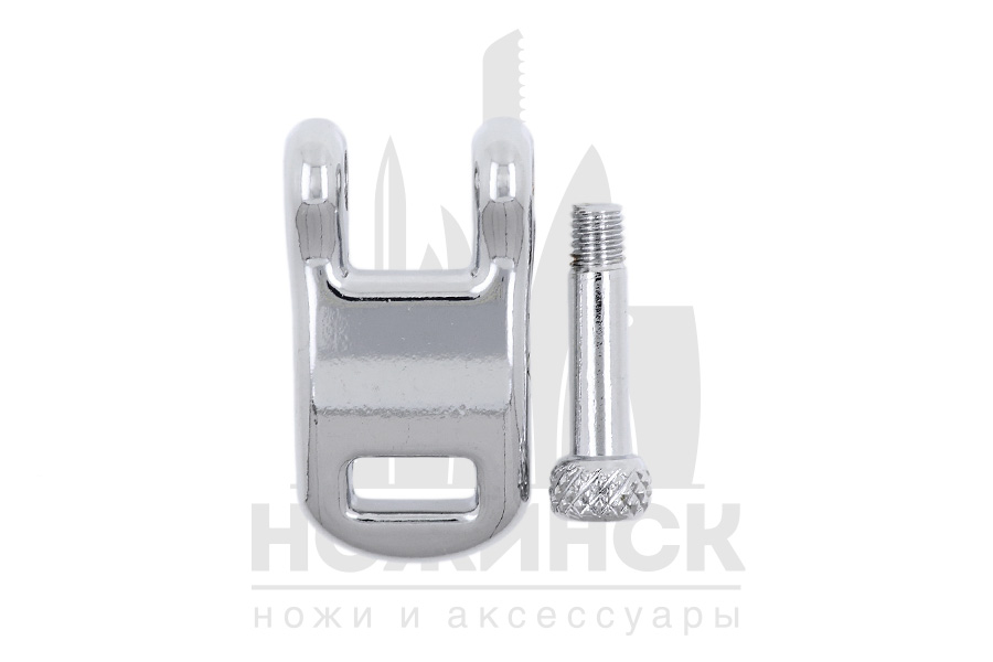 Хромированная металлическая застежка изготовлена из нержавеющей стали. Максимальные внешние габариты (20+4)×37 мм, отверстия для крепления размером 4,5×10 мм, винтовое 5,0×10 мм. Для удобства ношения застежка имеет легкий прогиб.