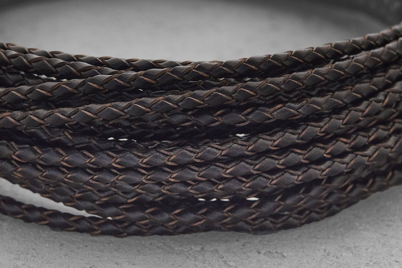 Плетёный шнурок из натуральной телячьей кожи, круглый в сечении, диаметр приблизительно 3,0±0,2 мм. Шнурок качественно сплетен из четырех полосок окрашенной кожи.