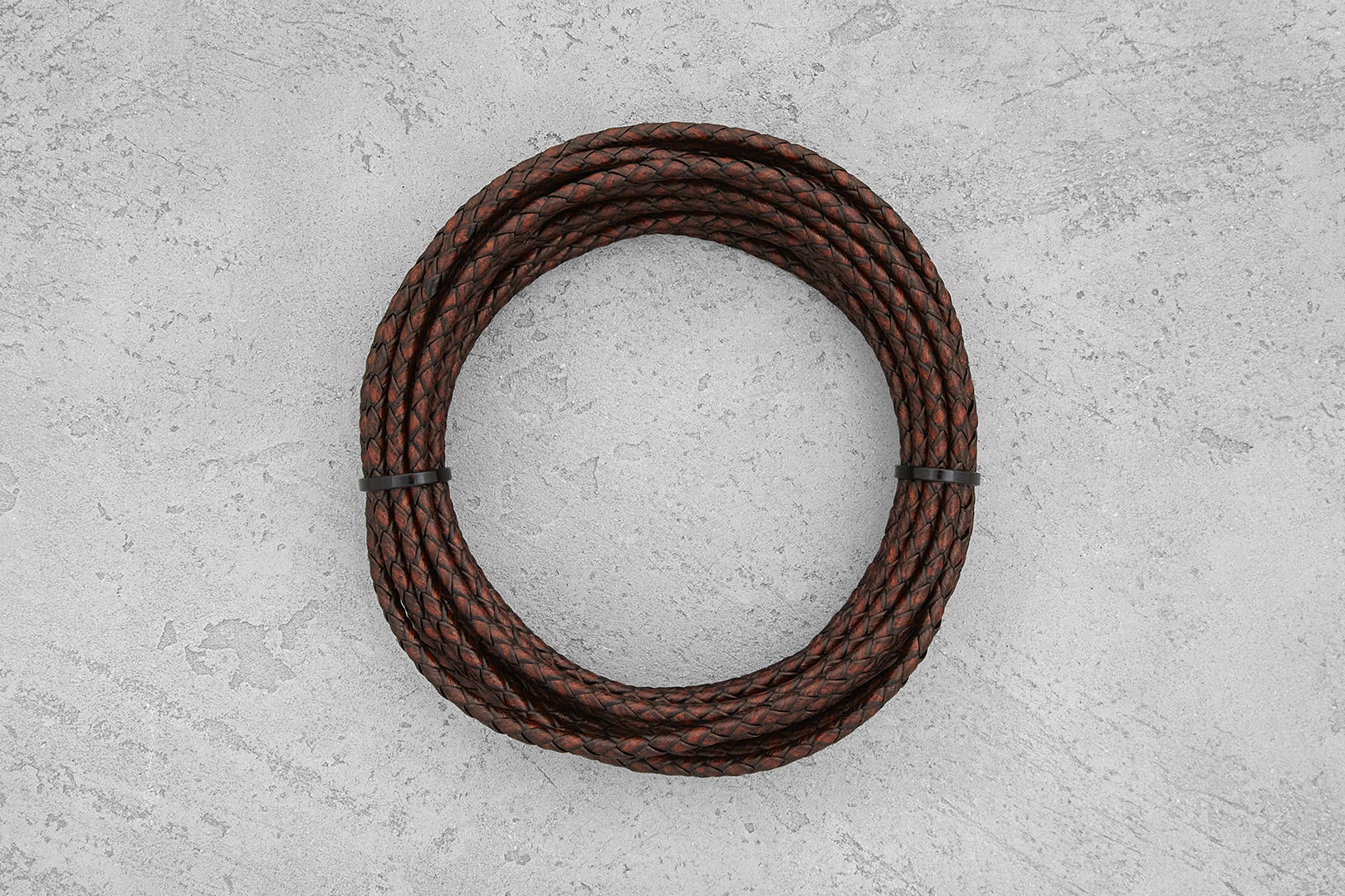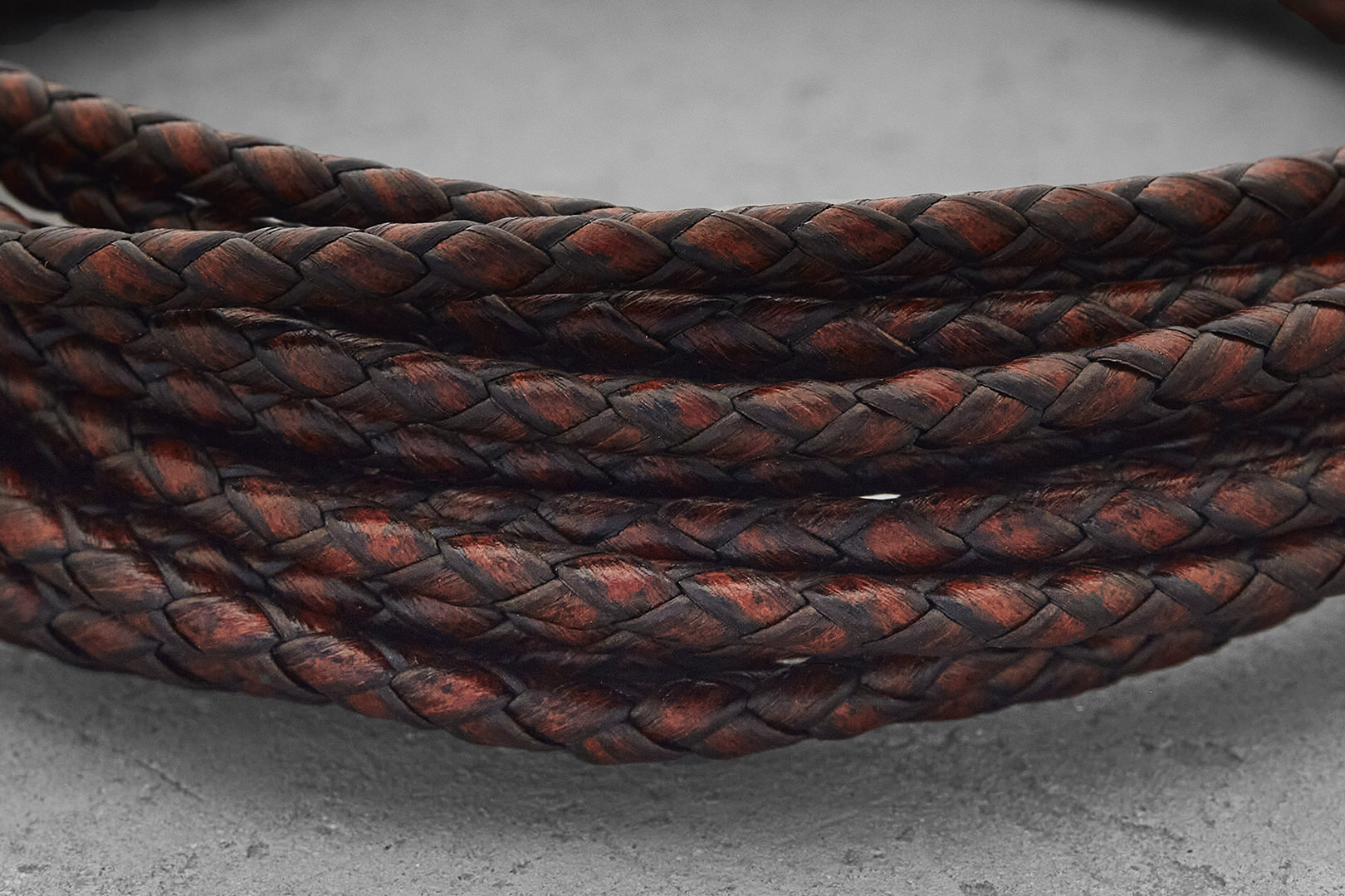 Плетёный шнурок из натуральной телячьей кожи, круглый в сечении, диаметр приблизительно 3,6±0,2 мм. Шнурок качественно сплетен из четырех полосок окрашенной кожи.