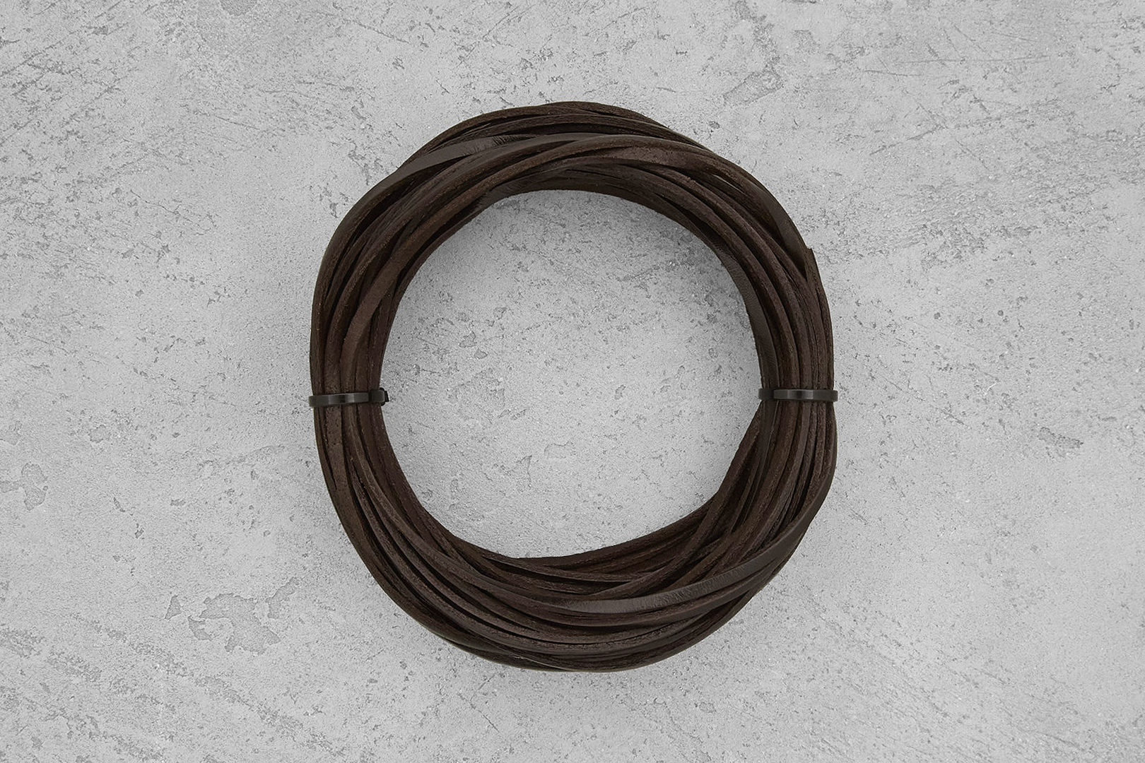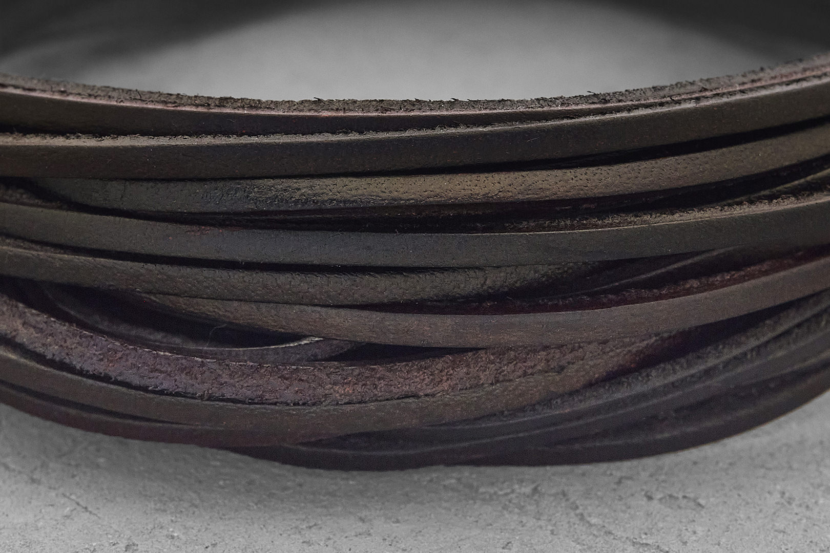 Шнурок из натуральной телячьей кожи, прямоугольного сечения 3×2мм. Кожа в центре светло-коричневая, поверхность шнурка покрашена и обладает легким глянцем. Максимальный отрез 5,0 м.