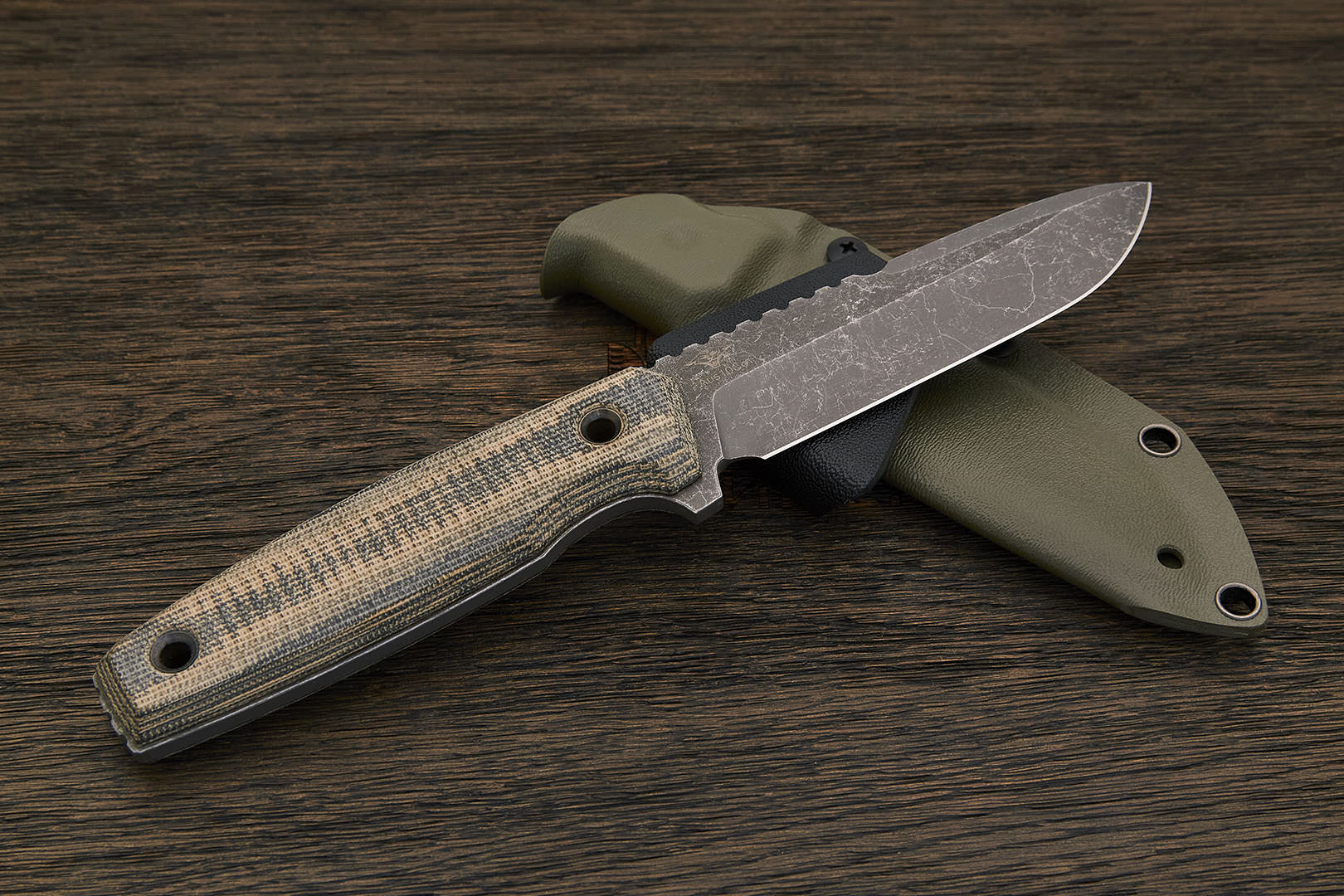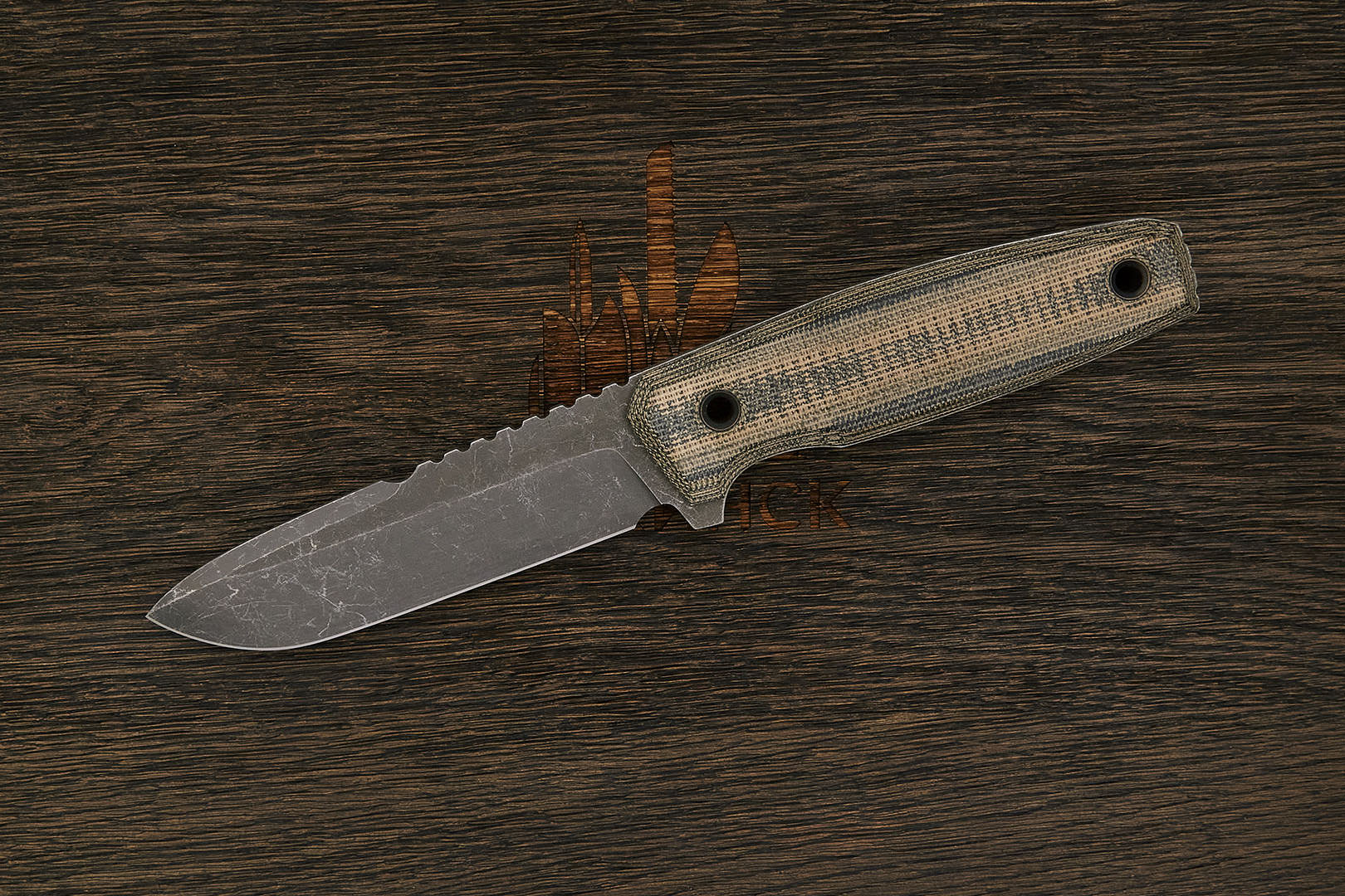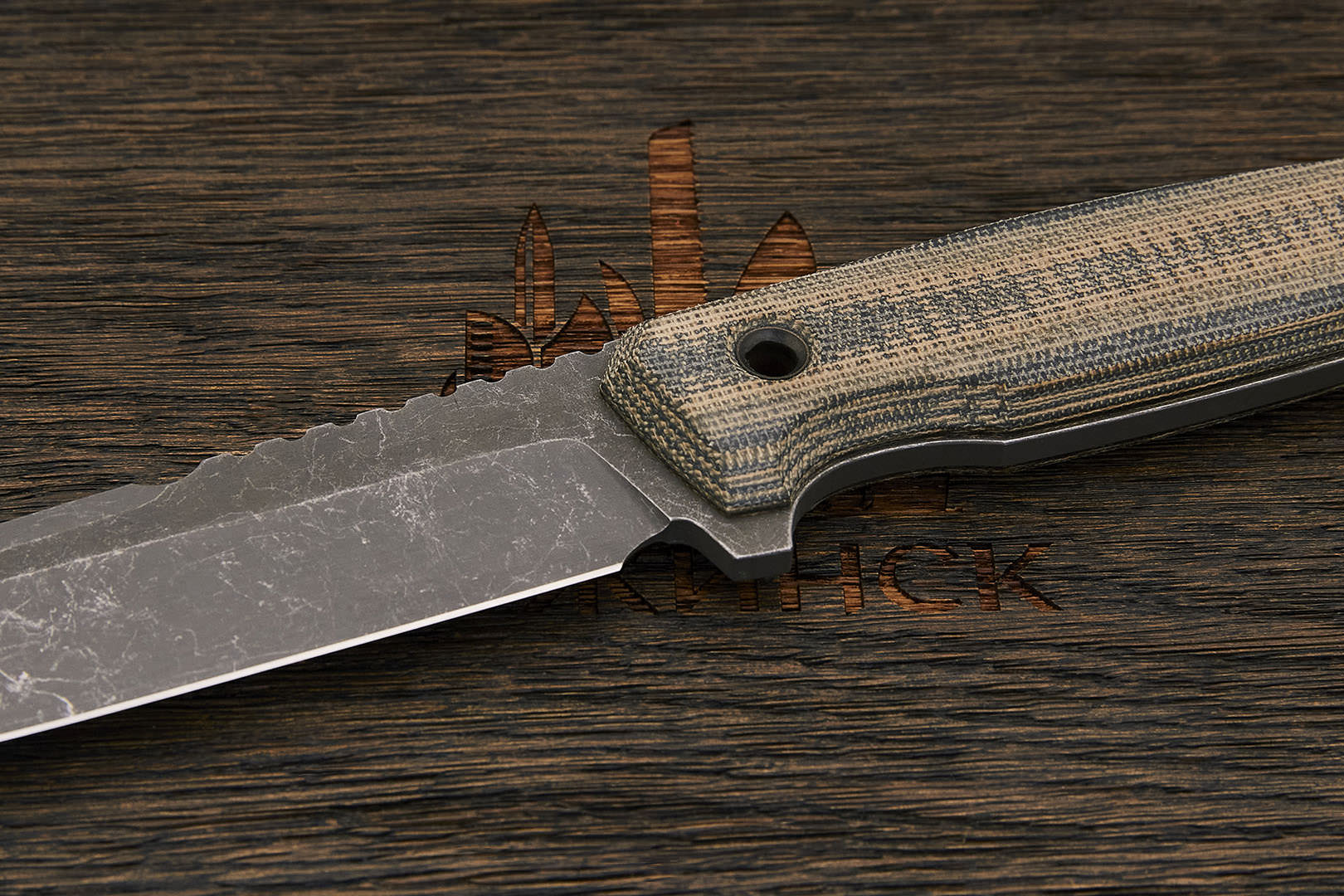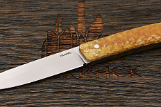 Микарта – очень прочный конструкционный материал, представляющий собой слоистый пластик на основе ткани и фенолформальдегидных или эпоксидных смол. Слои ткани пропитываются и склеиваются под высоким давлением и температурой. Благодаря совокупности потребительских свойств micarta (текстолит) прекрасно подходит для изготовления рукоятей ножей. Прочная, не впитывает ни воду, ни запахи, тактильная и высоко декоративная за счет разнообразия текстур и цветов. По теплопроводности микарта близка к натуральному дереву, что позволяет достаточно комфортно использовать ножи на сильном морозе.