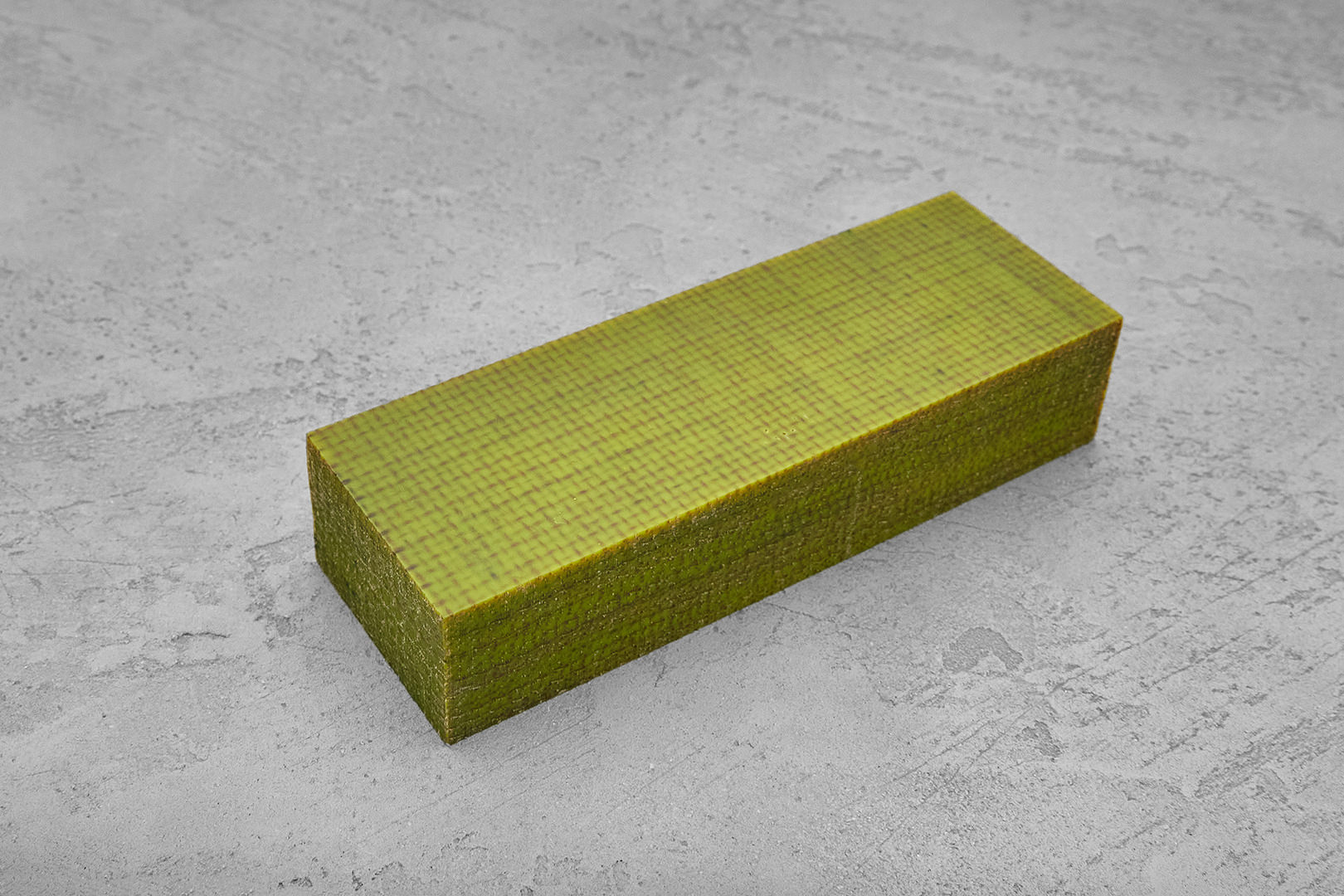 Блок для всадного монтажа рукояти ножа изготовлен методом вакуумного прессования из натурального джутового волокна и окрашенной эпоксидной смолы. Благодаря этому материал обладает оригинальной текстурой, насыщенным цветом и приятно ощущается в руке. Хорошо обрабатывается и полируется.