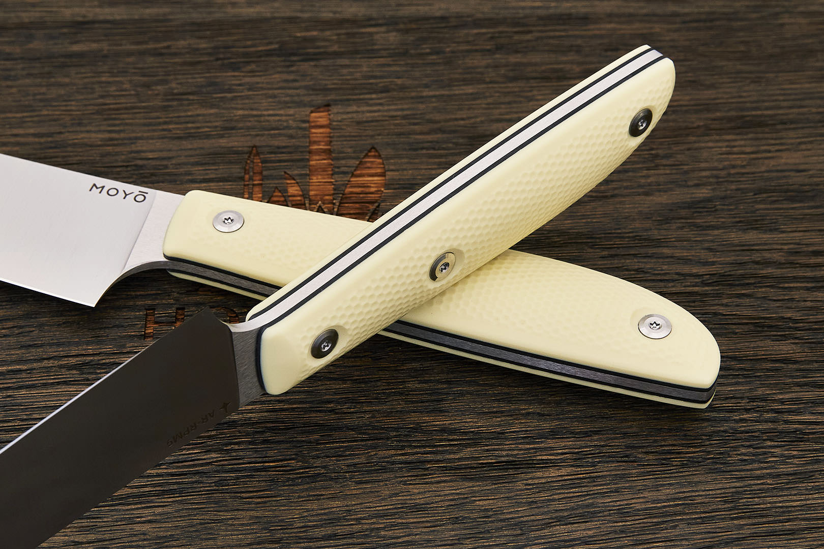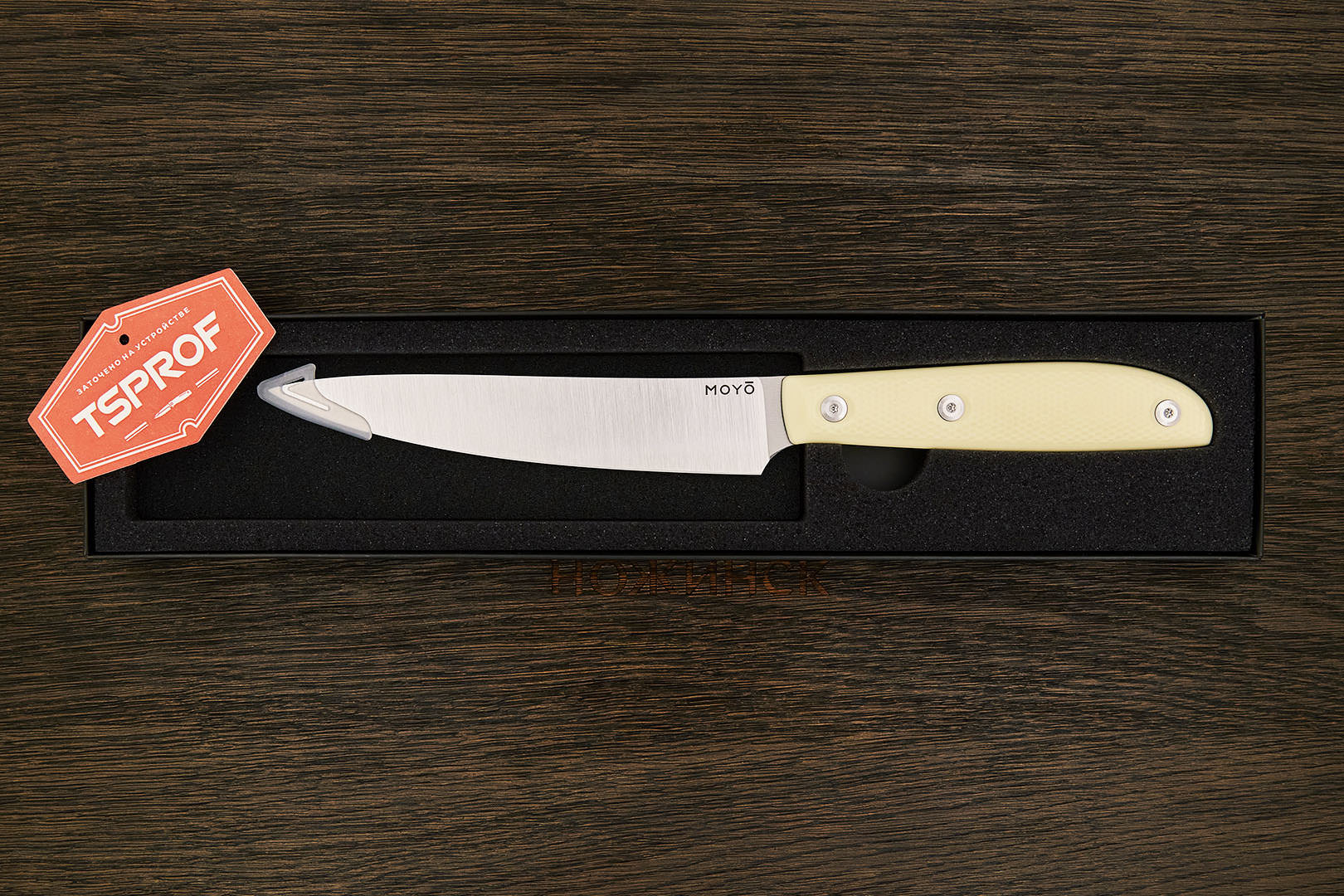 Все ножи MOYO изготовлены вручную с использованием передовых технологий и современных материалов. Композитные рукояти надежно и аккуратно собраны. Клинки с поперечным сатином имеют правильную геометрию и симметричное тонкое сведение. Режущая кромка сформирована на 15° с зеркальной полировкой в 10000 грит.