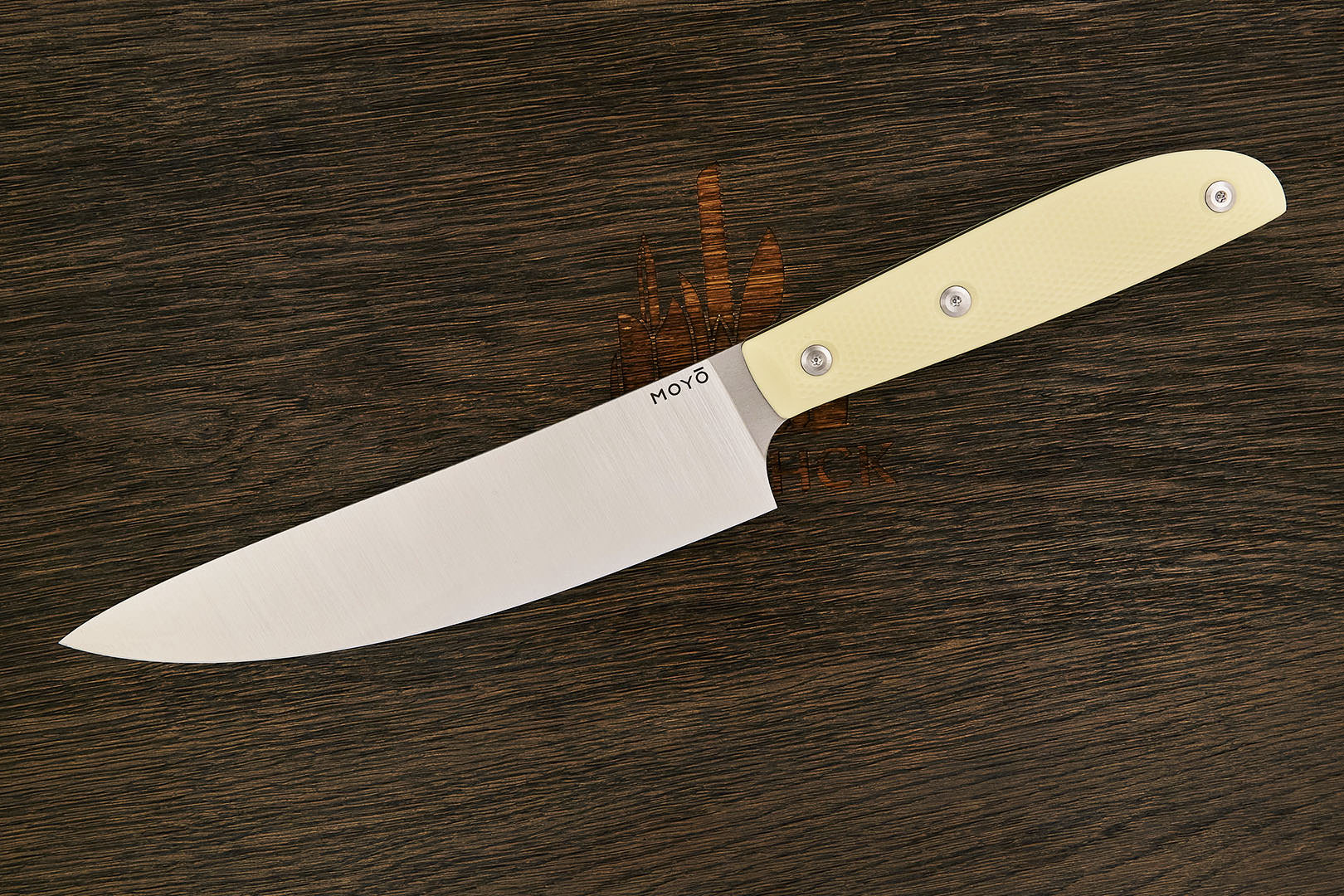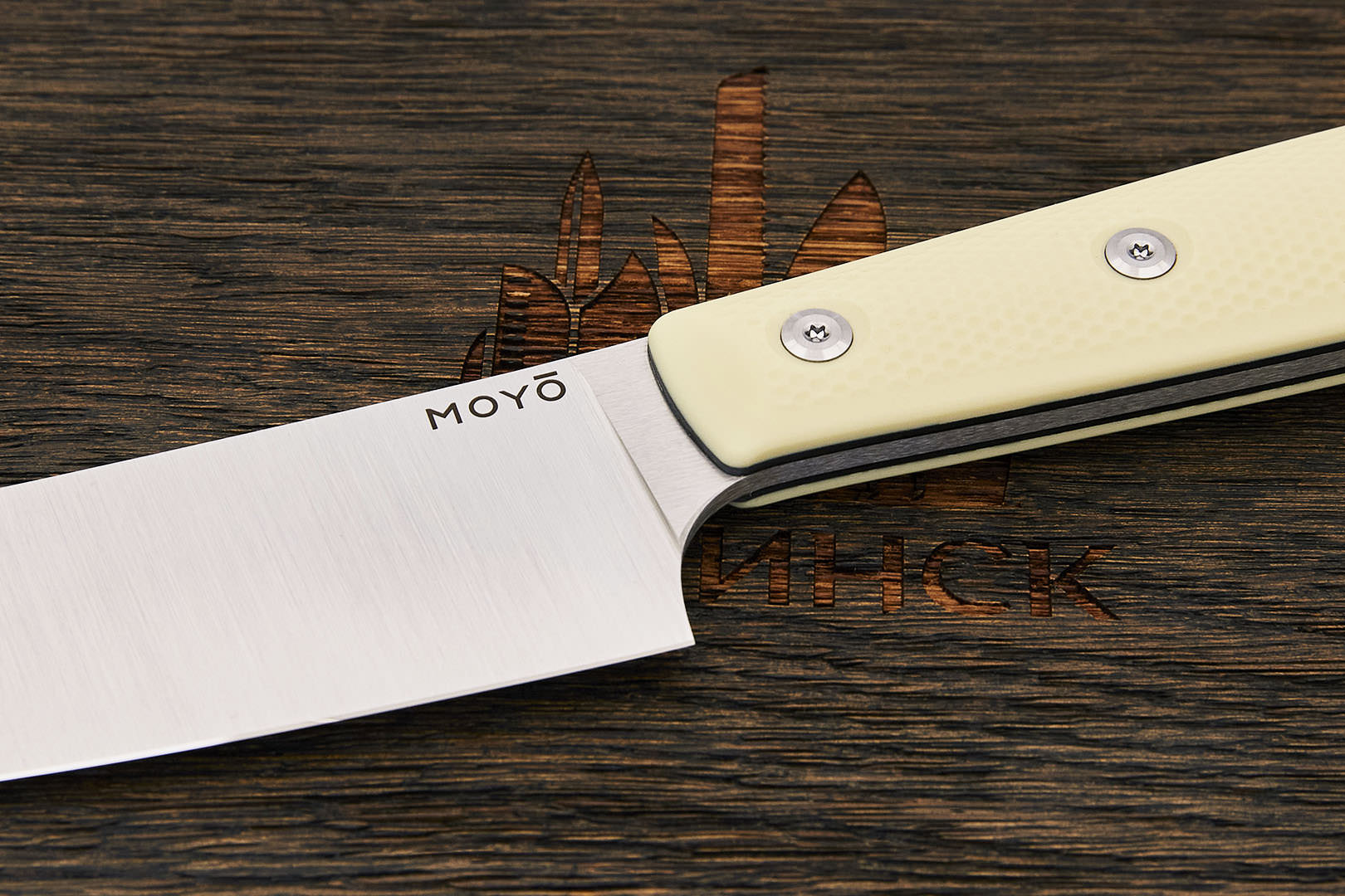 Все ножи MOYO изготовлены вручную с использованием передовых технологий и современных материалов. Композитные рукояти надежно и аккуратно собраны. Клинки с поперечным сатином имеют правильную геометрию и симметричное тонкое сведение. Режущая кромка сформирована на 15° с зеркальной полировкой в 10000 грит.
