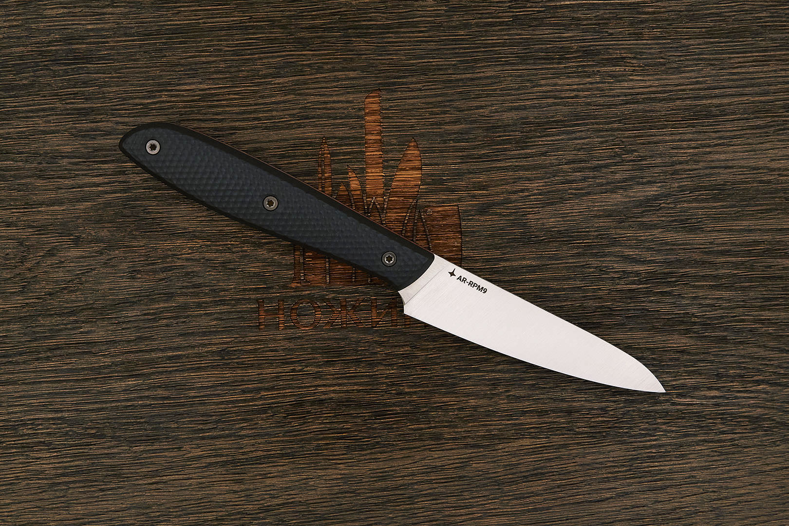 Рукоять продолжает линию обуха практически без наклона. Она достаточно крупная и полностью заполняет ладонь при классическом хвате за черен, а прямой обух позволяет сдвигать продукты с доски, перевернув нож, не нагружая режущую кромку. Текстура на поверхности рукояти приятно ощущается в руке, повышает управляемость и препятствует скольжению.