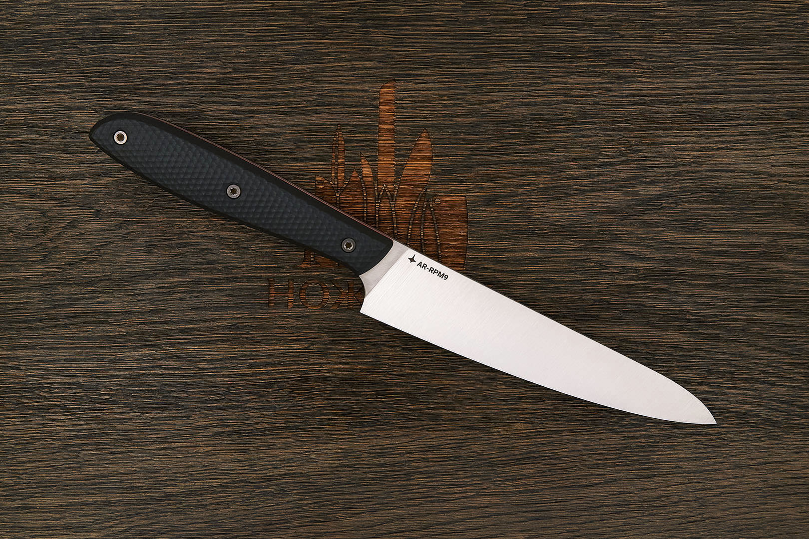 Рукоять продолжает линию обуха практически без наклона. Она достаточно крупная и полностью заполняет ладонь при классическом хвате за черен, а прямой обух позволяет сдвигать продукты с доски, перевернув нож, не нагружая режущую кромку. Текстура на поверхности рукояти приятно ощущается в руке, повышает управляемость и препятствует скольжению.