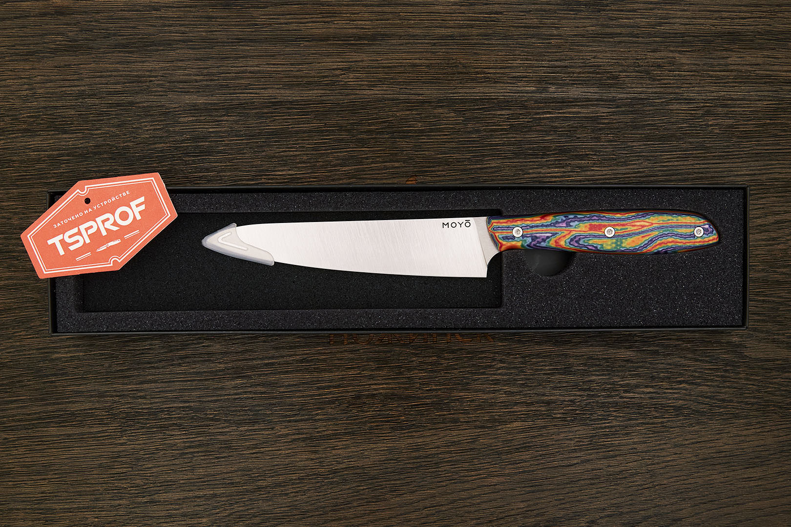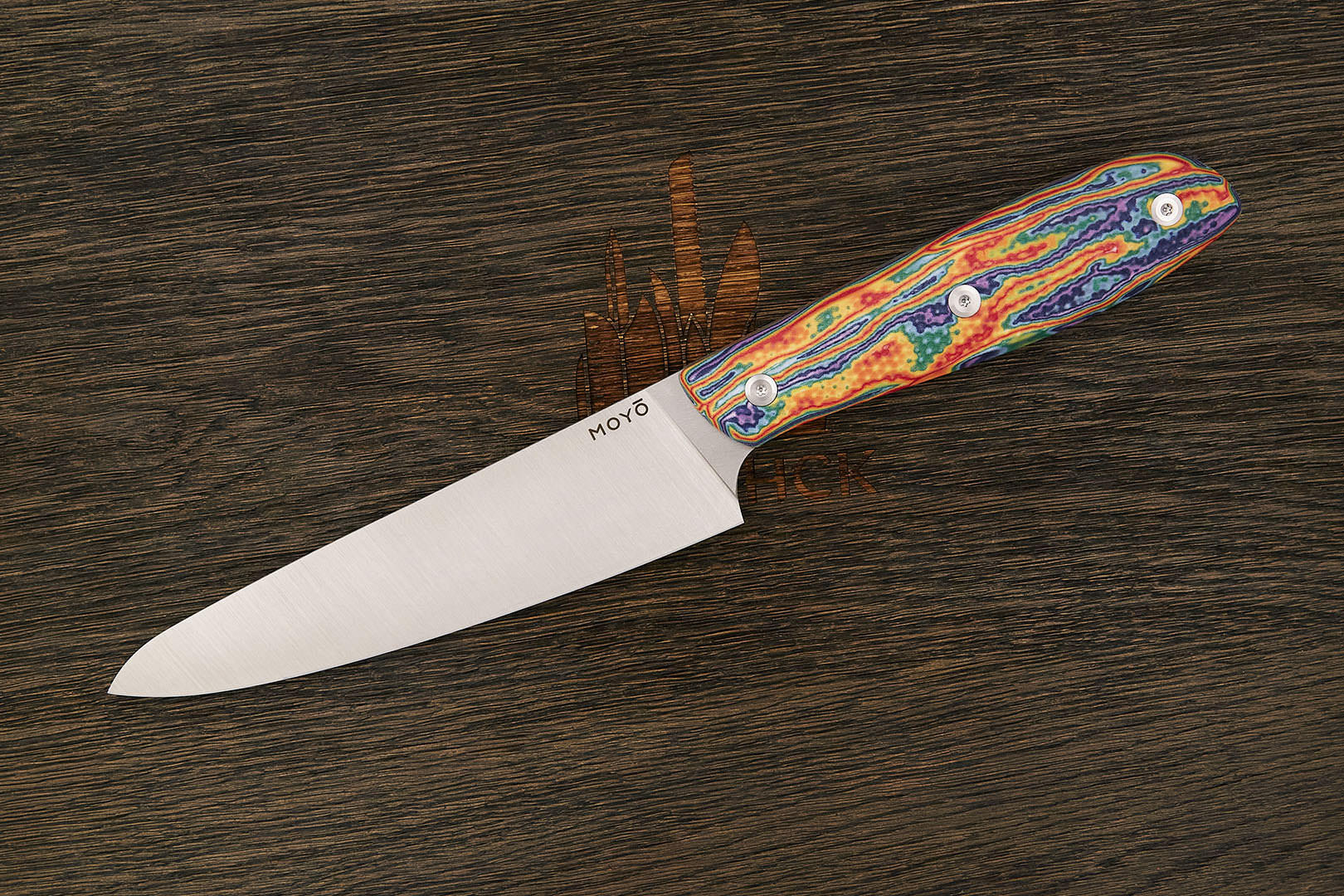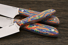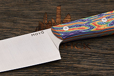 Все ножи MOYO изготовлены вручную с использованием передовых технологий и современных материалов. Композитные рукояти надежно и аккуратно собраны. Клинки с поперечным сатином имеют правильную геометрию и симметричное тонкое сведение. Режущая кромка сформирована на 15° с зеркальной полировкой в 10000 грит.