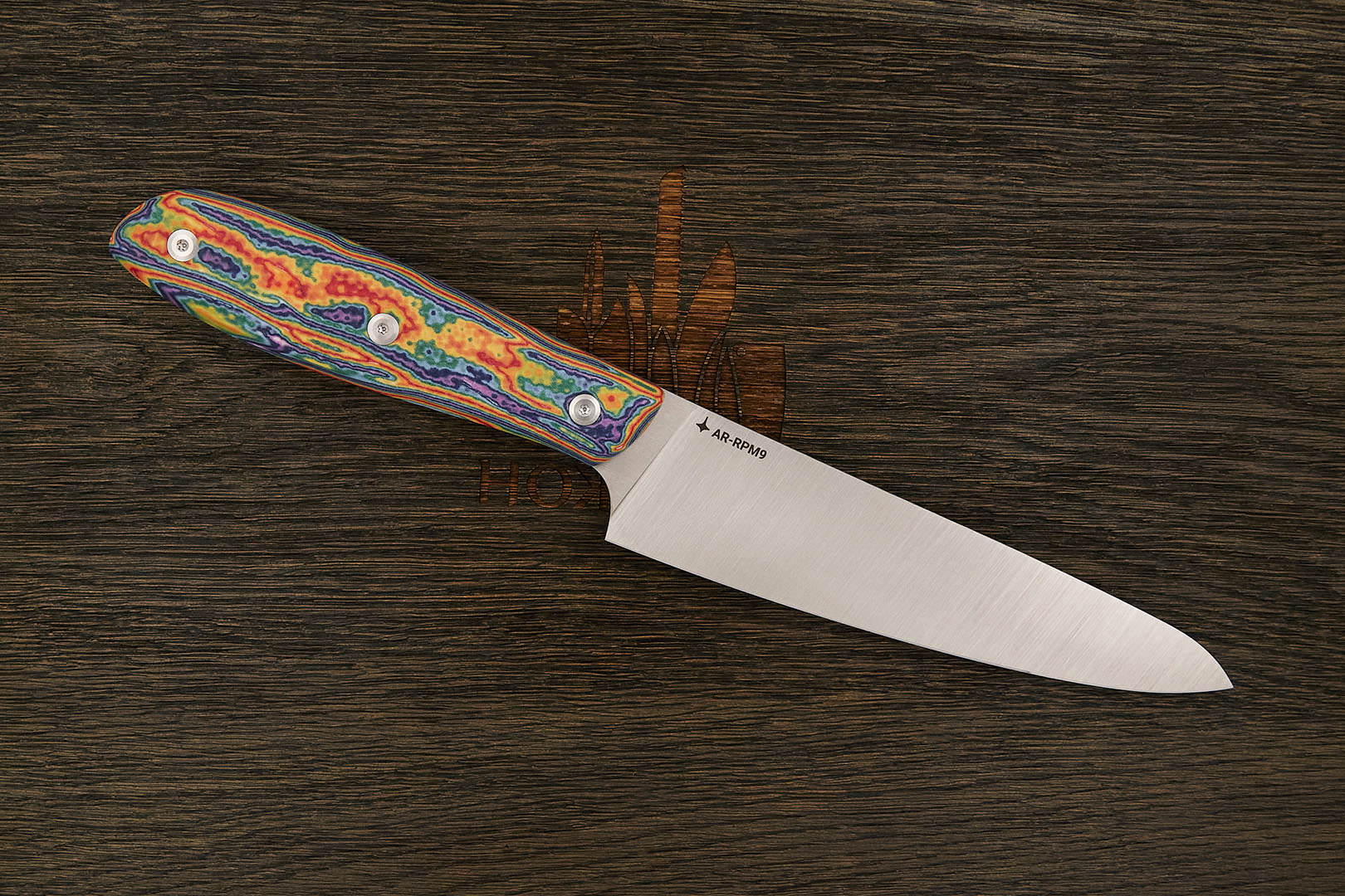 Рукоять продолжает линию обуха практически без наклона. Она достаточно крупная и полностью заполняет ладонь при классическом хвате за черен, а прямой обух позволяет сдвигать продукты с доски, перевернув нож, не нагружая режущую кромку. Текстура на поверхности рукояти приятно ощущается в руке, повышает управляемость и препятствует скольжению.