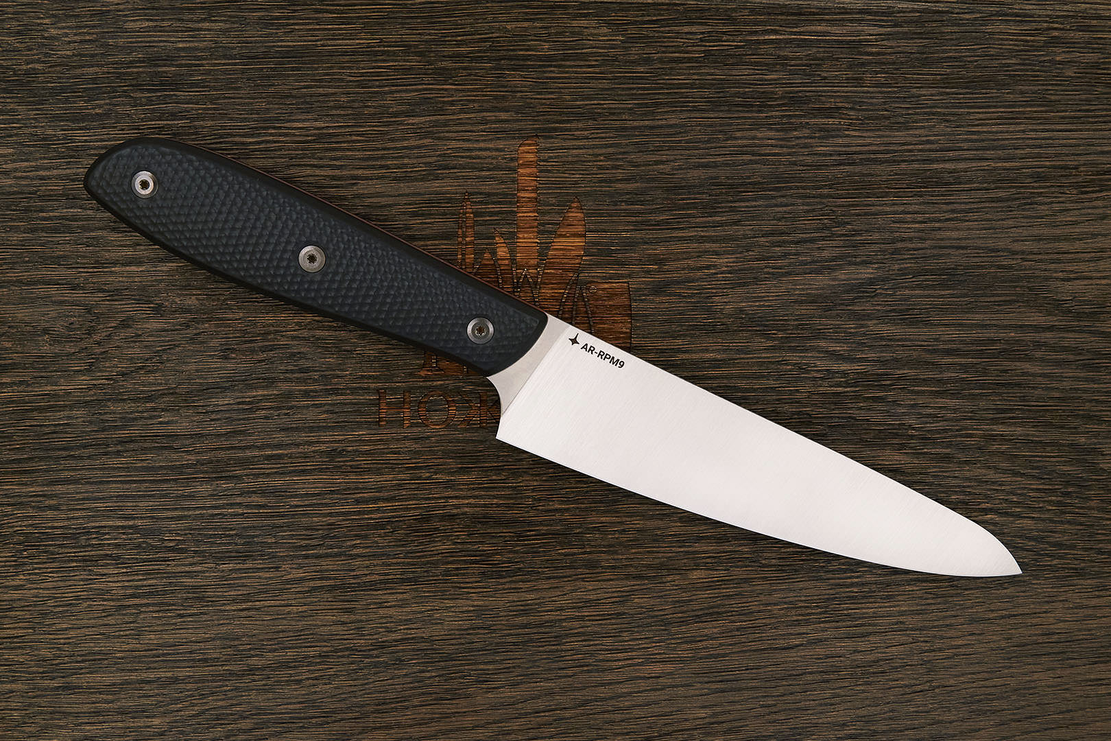 Рукоять продолжает линию обуха практически без наклона. Она достаточно крупная и полностью заполняет ладонь при классическом хвате за черен, а прямой обух позволяет сдвигать продукты с доски, перевернув нож, не нагружая режущую кромку. Текстура на поверхности рукояти приятно ощущается в руке, повышает управляемость и препятствует скольжению.