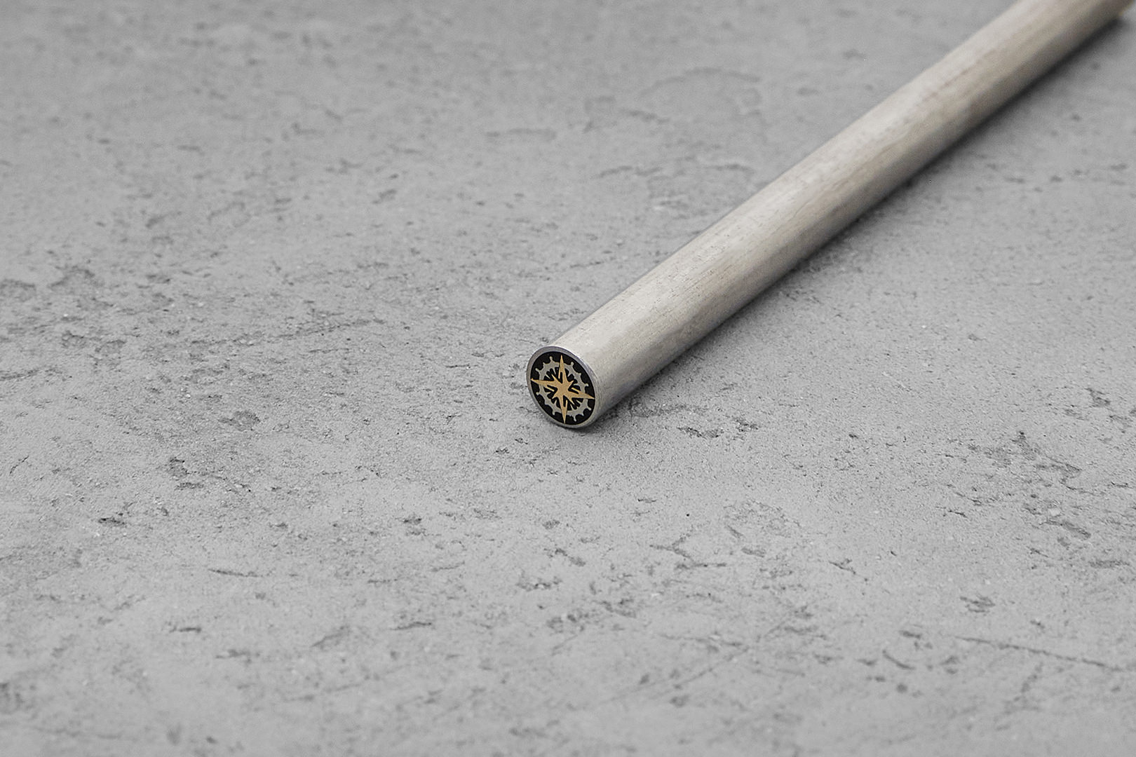 Мозаичная втулка, пин диаметром 8,0 мм и длиной 100±0,5 мм со вставкой, изготовленной по технологии электроэрозионной резки. Внешний контур пина выполнен из стали, центральная часть - из стали и латуни.