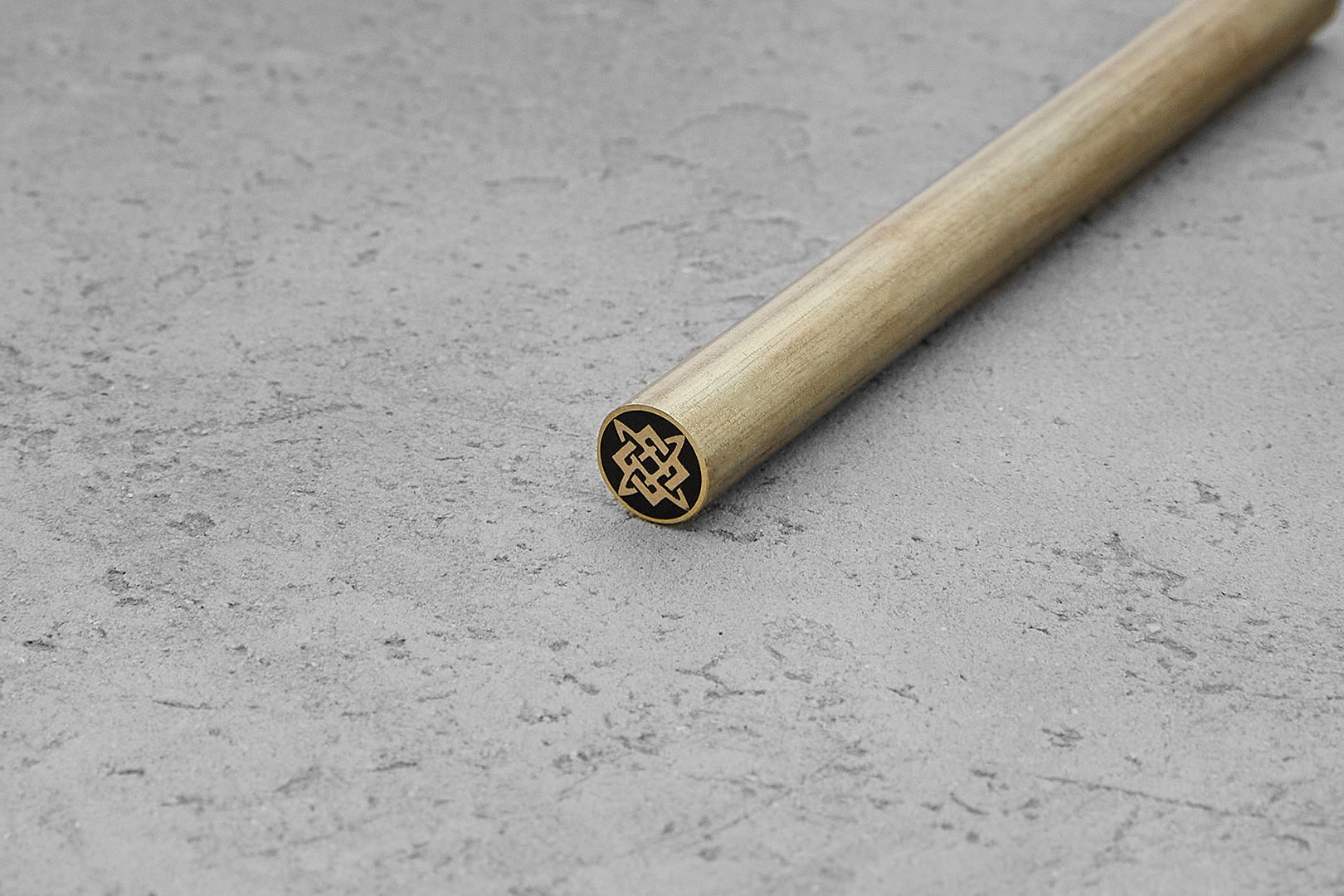 Мозаичная втулка, пин диаметром 10,0 мм и длиной 100±0,2 мм со вставкой, изготовленной по технологии электроэрозионной резки. Внешний контур и центральная часть пина выполнены из латуни.
