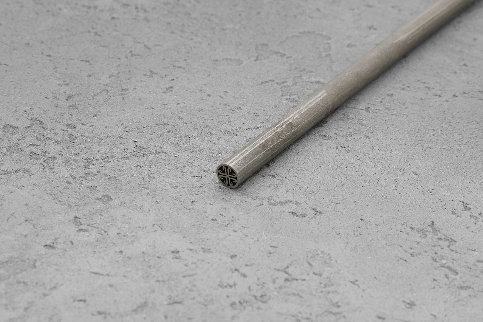 Мозаичная втулка, пин диаметром 6,0 мм и длиной 100±0,5 мм со вставкой, изготовленной по технологии электроэрозионной резки. Внешний контур пина и центральная часть выполнены из стали.