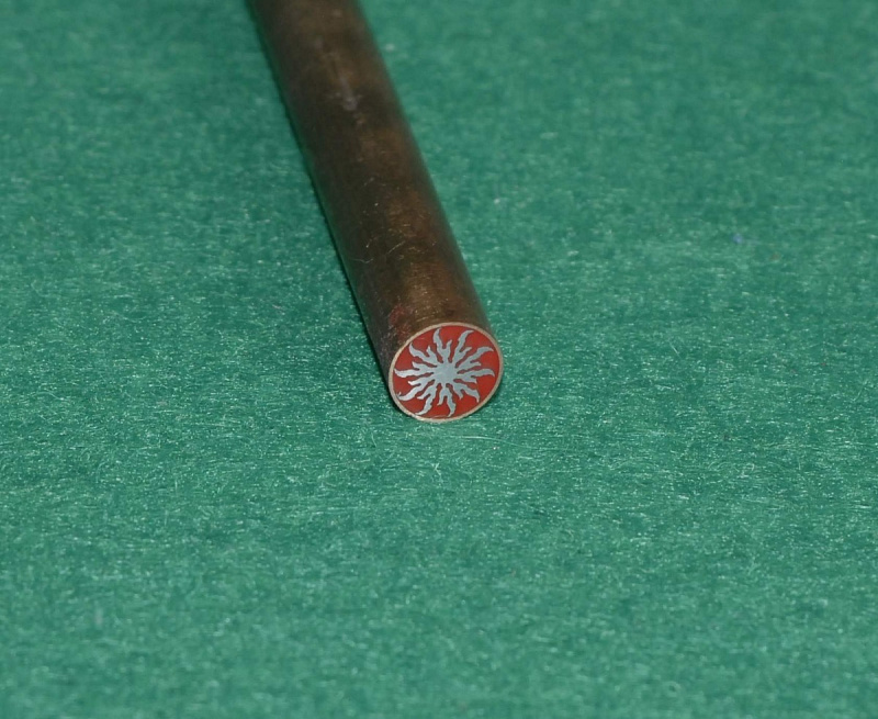 Мозаичная втулка, пин диаметром 8,0 мм и длиной 100±0,5 мм со вставкой, изготовленной по технологии электроэрозионной резки. Внешний контур пина выполнен из меди, центральная часть - из стали.