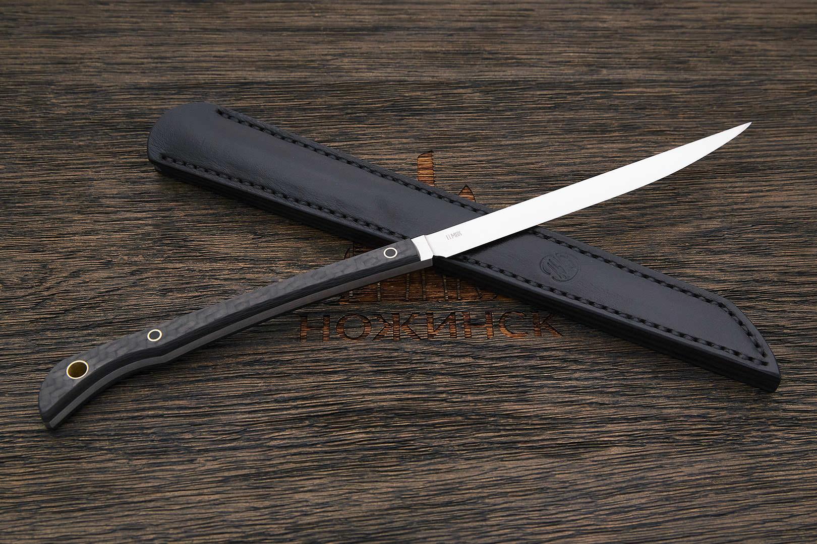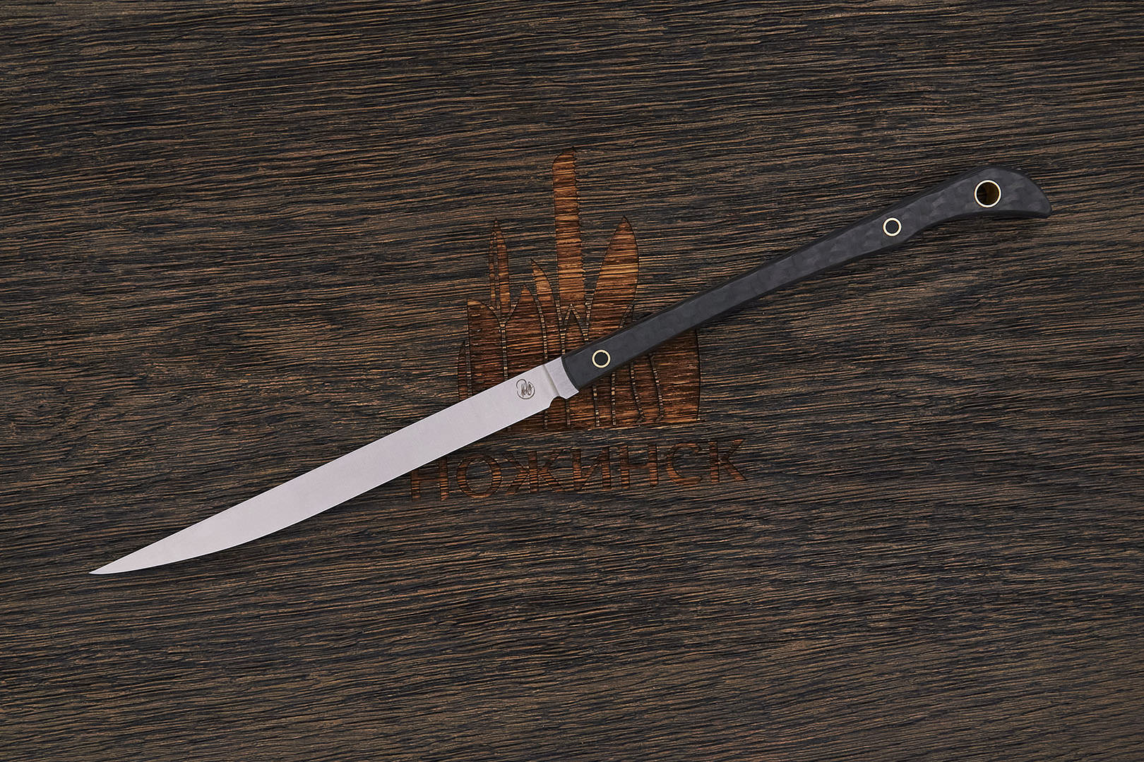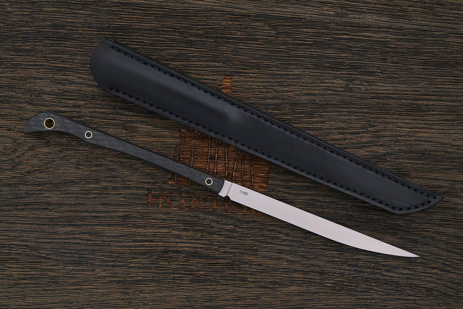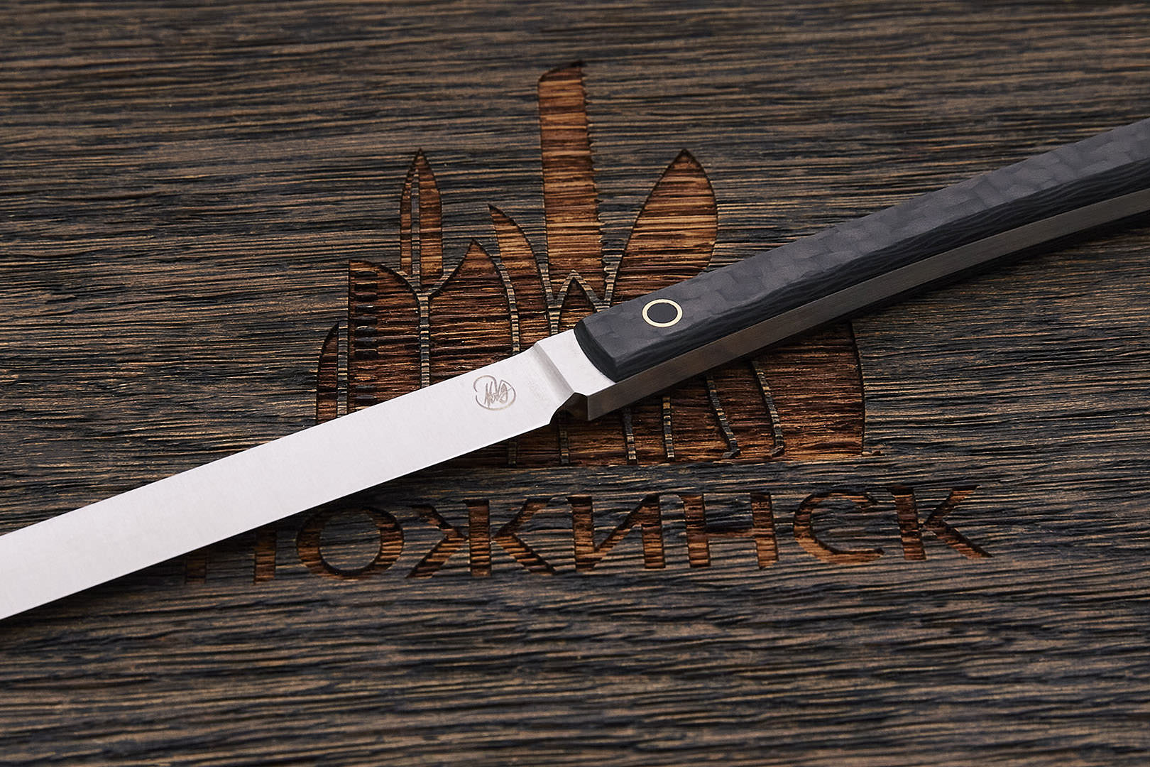 На сегодняшний день карбон один из лучших материалов для изготовления рукоятей ножей. Строгий по фактуре, нейтральный по цвету от светло-серого до почти черного, он практически не скользит в руке. Чрезвычайно прочный, абсолютно не впитывает ни воду, ни запахи, отлично переносит перепады влажности и температуры. Пожалуй, единственный его недостаток — сложная технология производства и, как следствие, высокая цена.