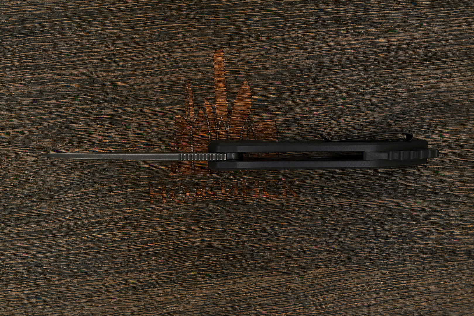 Удобный складной нож для повседневных задач. Обух клинка имеет насечку для упора большим пальцем и плавно опускается к острию, образуя форму drop point с ярко выраженным пузиком на лезвии. Раскрытие ножа производится за плавник, выступающий над спинкой рукоятки в закрытом виде и выполняющий роль подпальцевого упора в раскрытом. Осевой узел оборудован керамическими подшипниками, обеспечивающими плавное и легкое открывание. Фиксацию клинка в раскрытом состоянии обеспечивает механизм Liner Lock, а установленный в нем шарик детента защищает от случайного выбрасывания. Рукоятка выполнена в виде текстурированных накладок, позволяющих надежно удерживать нож в ладони при активной работе. Благодаря своему плоскому профилю в закрытом состоянии и клипсе, нож удобно и незаметно помещается в кармане. В тыльной части на бэкспейсере выполнено отверстие под темлячный шнур.