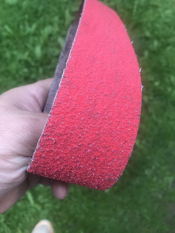 Важно соблюдать рекомендуемую скорость ленты 25-30 м/с. При такой скорости происходит резка обрабатываемого материала и оптимальное обновление абразивного зерна. При снижении скорости зерно не скалывается, освежая острые грани, а истирается. Многократно возрастает нагрузка, вырывающая его из связки, и лента «лысеет», кроме того, происходит сильный нагрев зоны шлифования, недопустимый при изготовлении ножей.