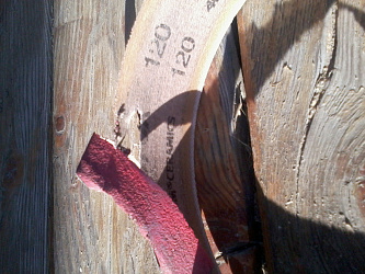 Приобретал такие ленты уже несколько раз и всегда был доволен результатом. Лента отлично шлифует и заравнивает риски после Р60. Но с этой лентой что-то пошло не так. Причем с самого начала. Сразу еще смутило, что место склейки не очень ровное. Первый запуск производил аккуратненько и не зря - кусок ленты из середины просто вырвало. Но поскольку лента новая и выкидывать было как-то жалко, какое-то время еще поработал на такой "дырявой ленте". А потом она начала просто отрываться по краям серпантином. Итог видно на фото.
